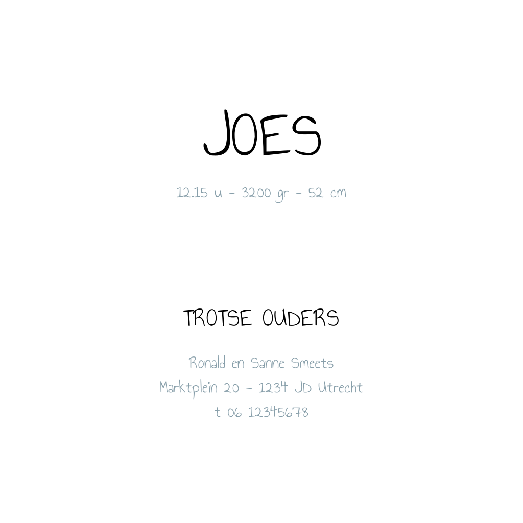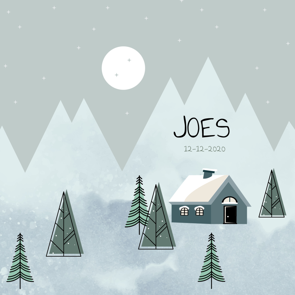 Een winters geboortekaartje met een knus huisje midden in de sneeuw. Wordt jullie zoon in de winter geboren? Dan is deze kaart perfect!