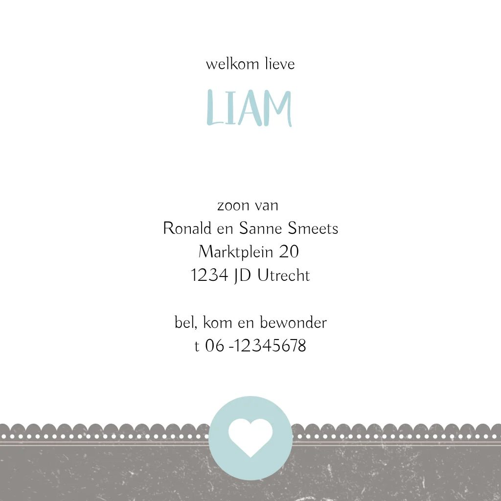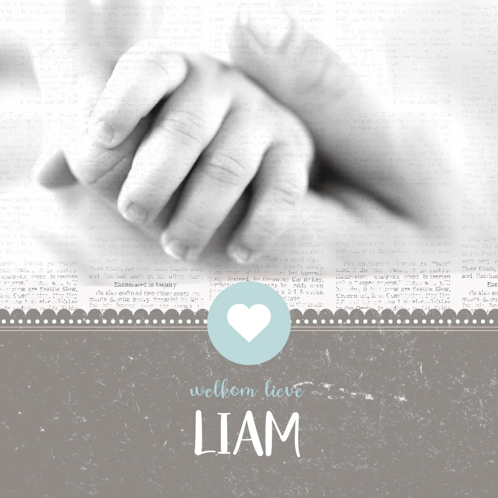 Lief geboortekaartje voor jongen met zwart wit foto van baby handjes