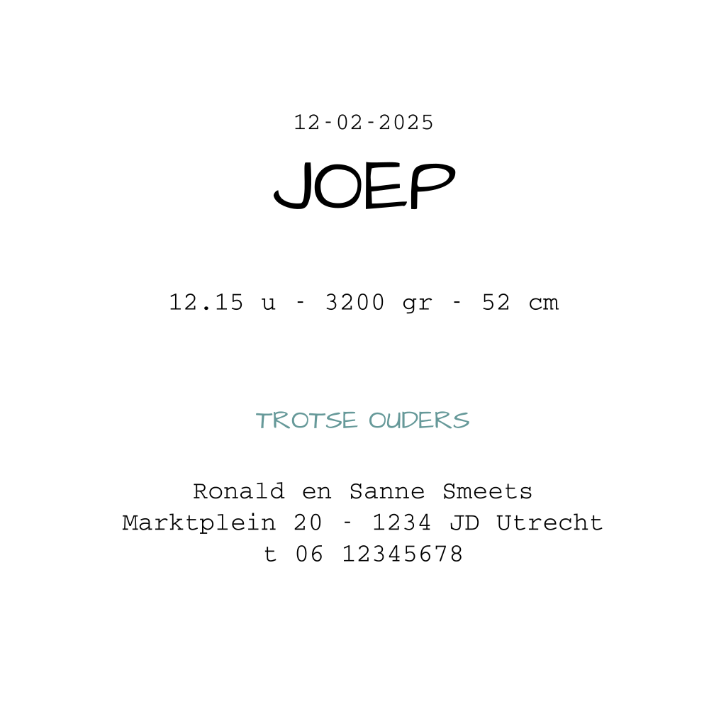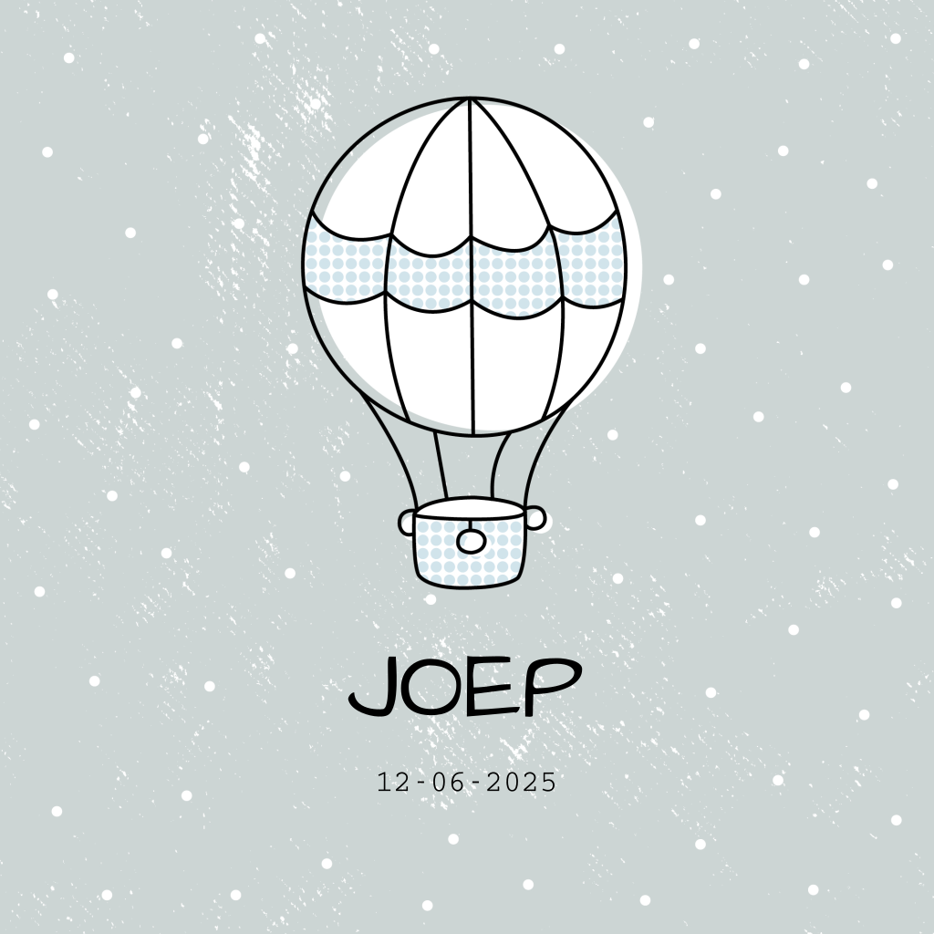 Schattig geboortekaartje voor je zoon met een illustratie van een zwevende luchtballon op een grijze achtergrond met stipjes.Plaats zelf de teksten en elementen eenvoudig op de juiste plek in onze opmaaktool. Heb je hier hulp bij nodig? Neem gerust even contact met ons op!