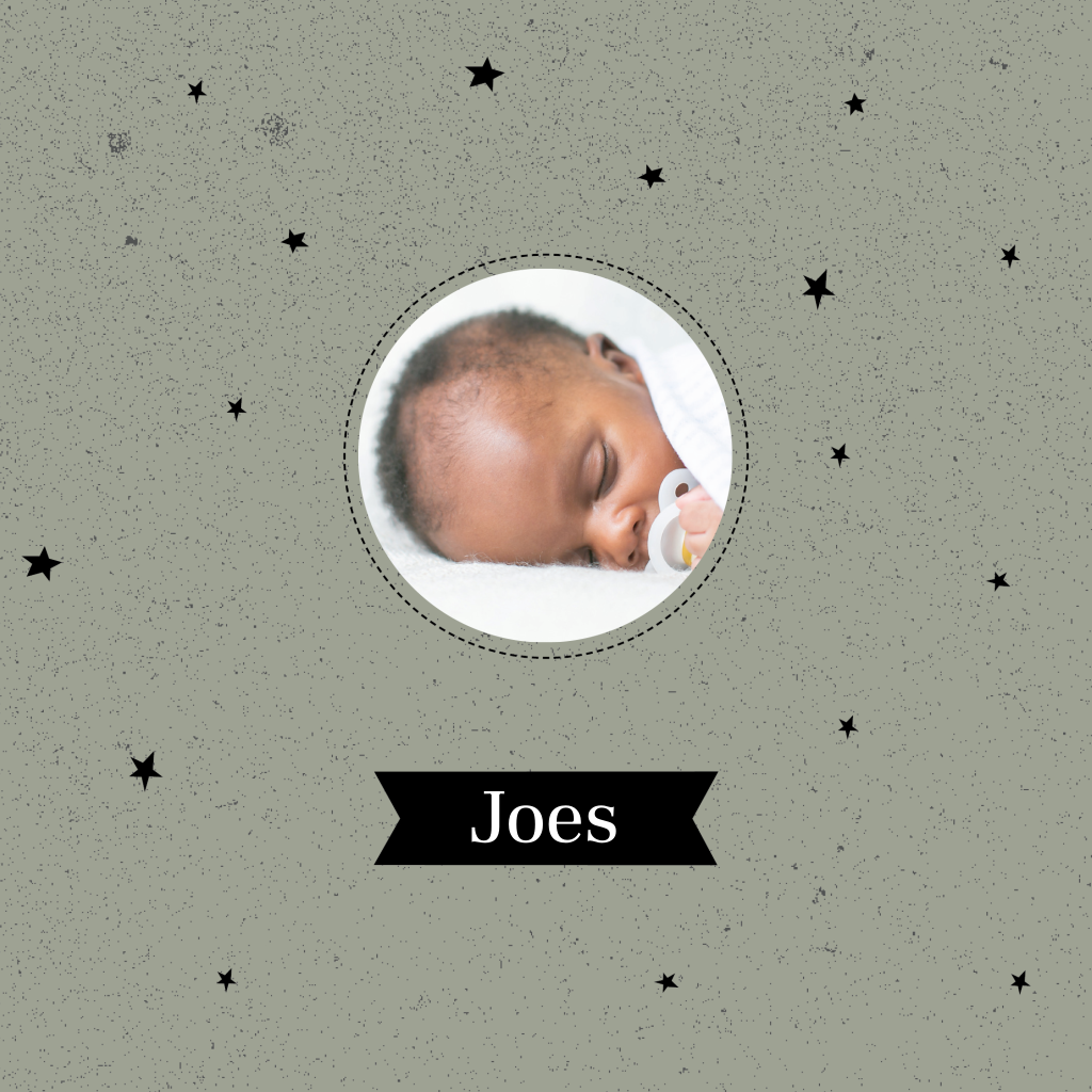 Stoer geboortekaartje voor jongen met foto en sterretjes