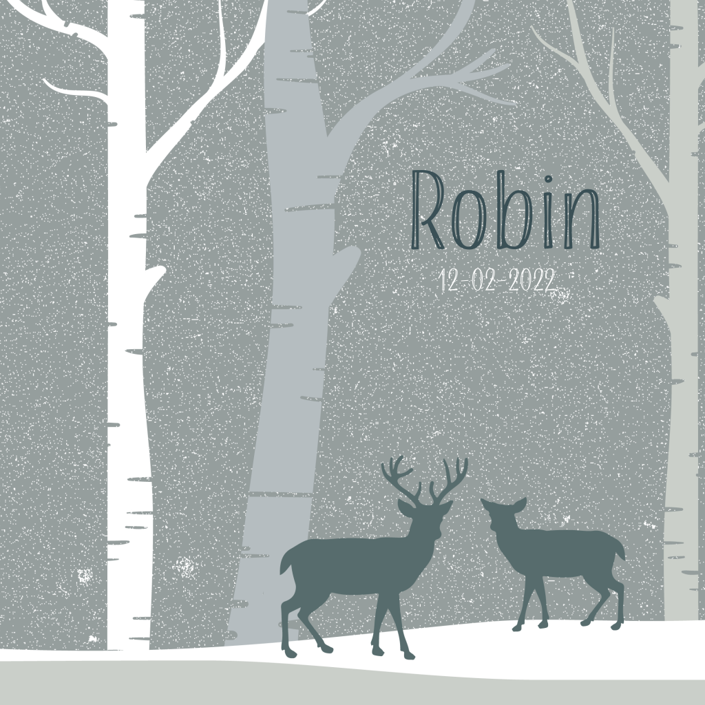 Een winters geboortekaartje voor een jongen met een winterlandschap en een lieflijk tafereeltje met hertjes.