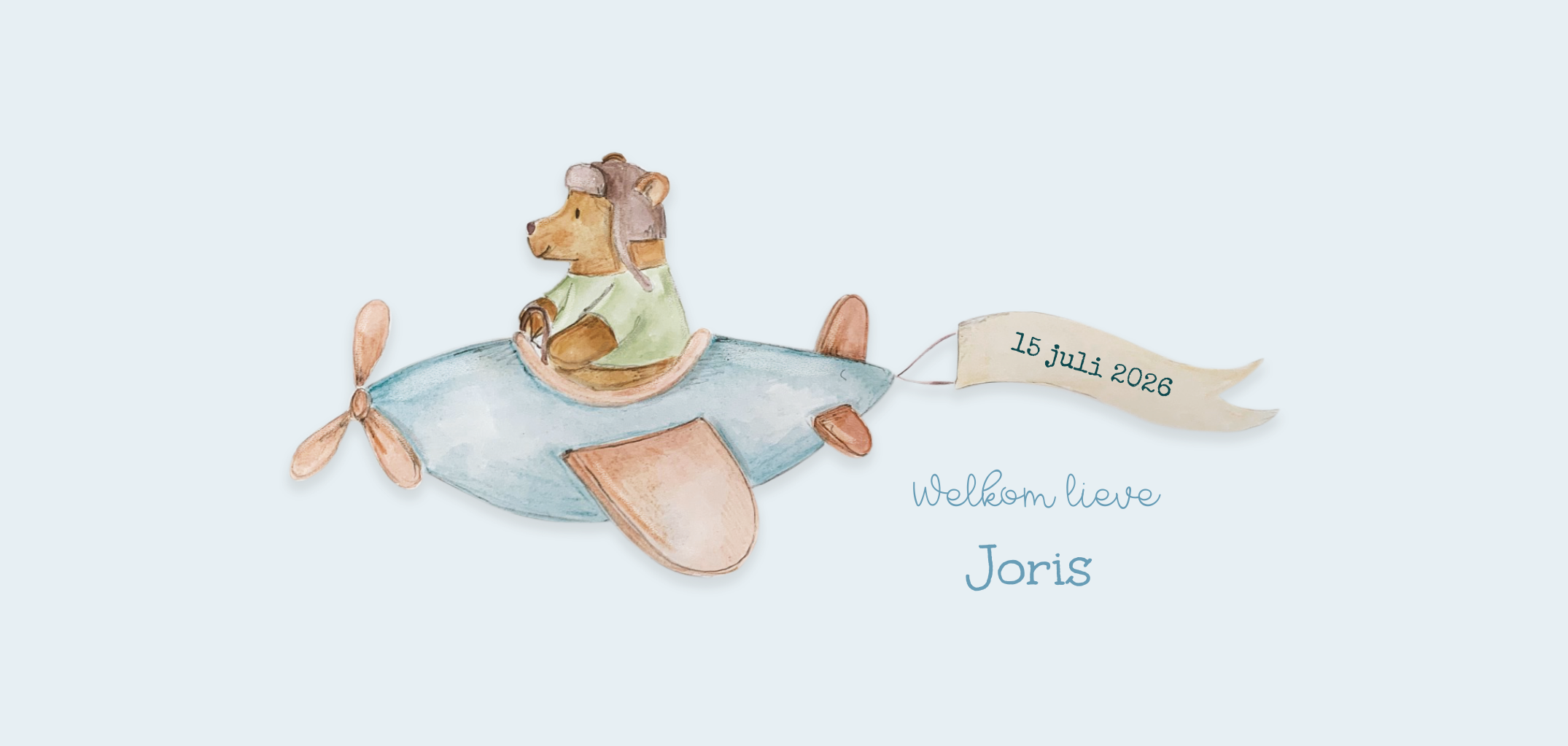 Wat een tof geboortekaartje! Een panorama geboortekaartje voor jouw zoontje. Op het blauwe kaartje zie een beertje in een vliegtuigje zitten met de geboortedatum van jouw kindje. Het kaartje is volledig te personaliseren in onze online editor.