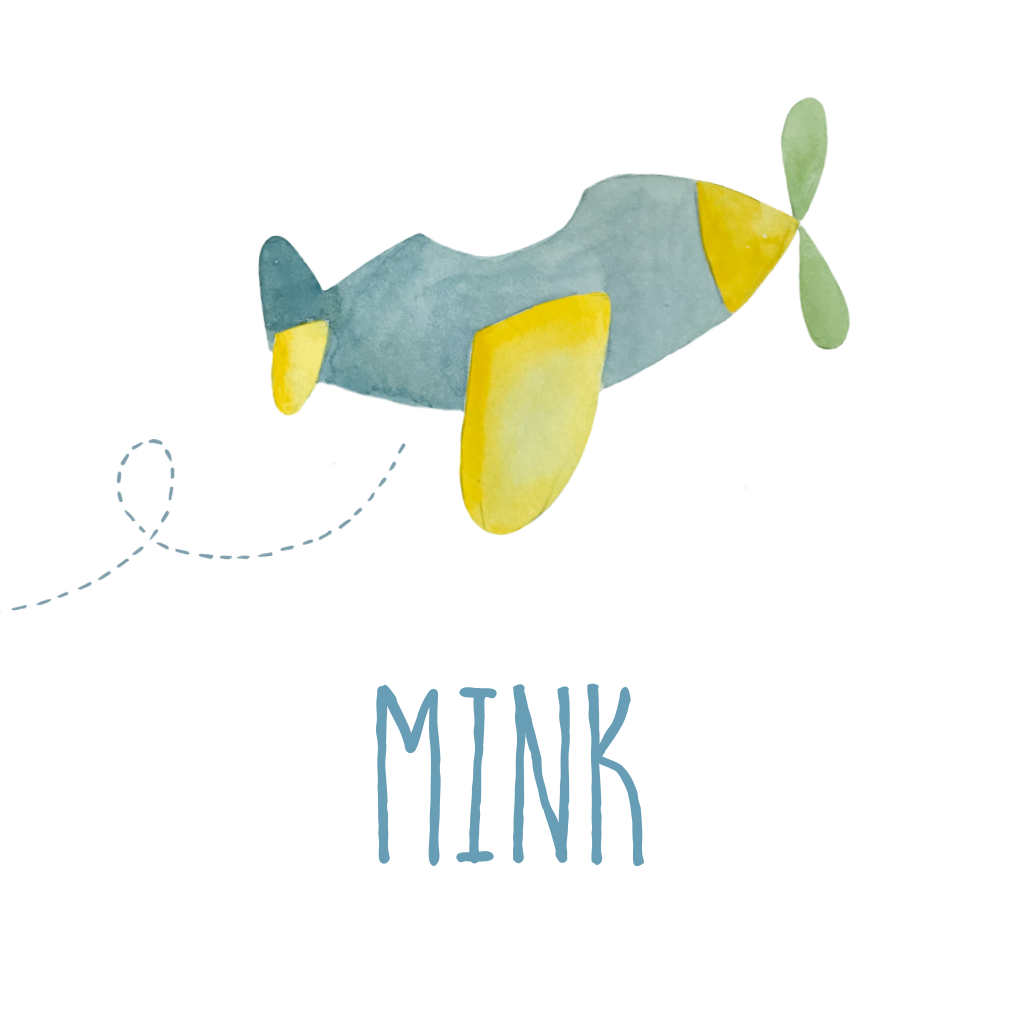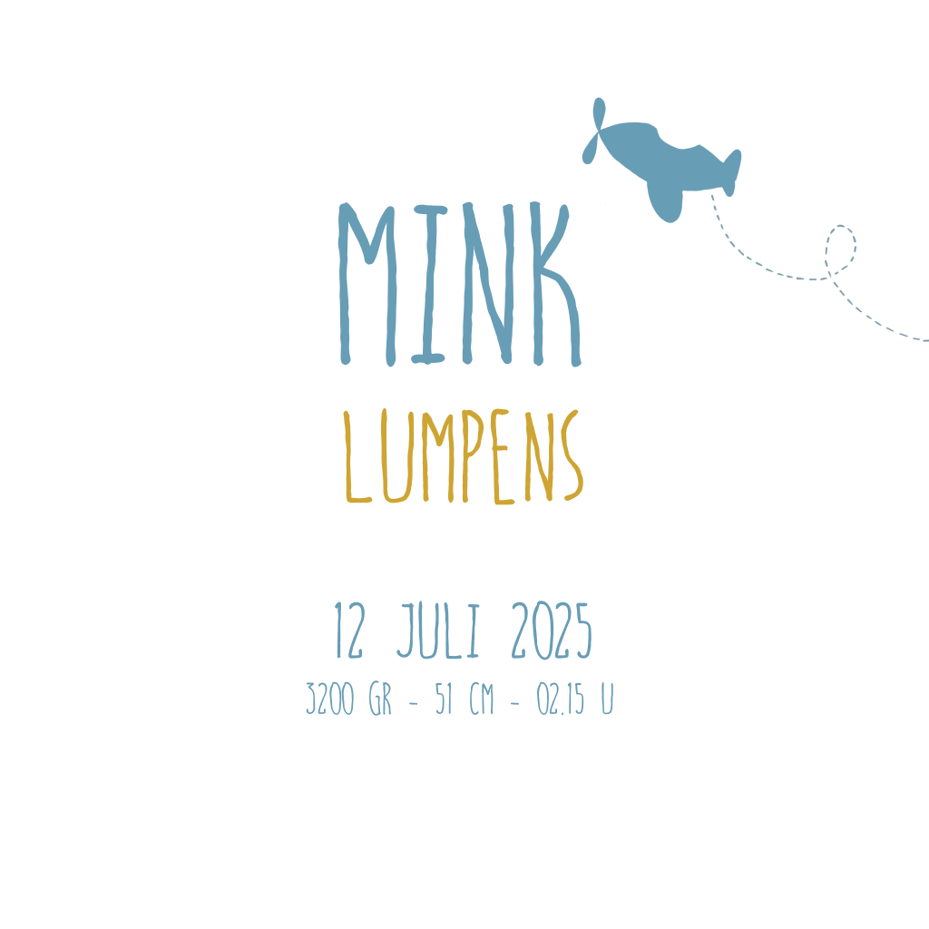 Wat een stoer, vierkant geboortekaartje voor een jongen. Het vliegtuig is gemaakt van waterverf en heeft een speels beweegeffect door de stippellijnen. Maak hem compleet met eigen teksten en een bijpassende envelop!