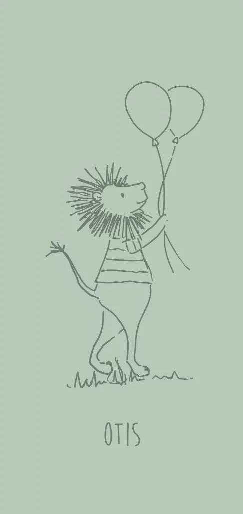 Groen geboortekaartje met lijntekening van leeuw met ballonnen