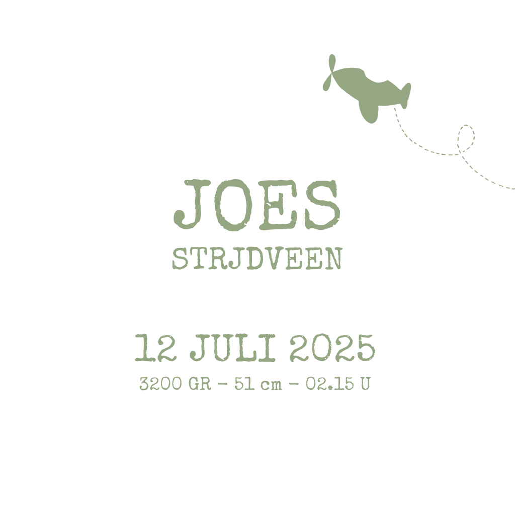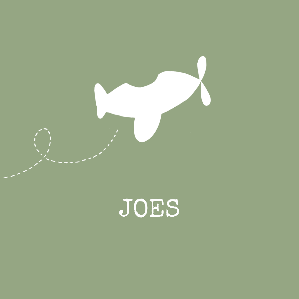 Legergroen geboortekaartje voor een zoontje. Leuk met een wit silhouet van een vliegtuigje! Aan de binnenkant zijn de kleuren omgekeerd. Iets voor jouw stoere jochie?