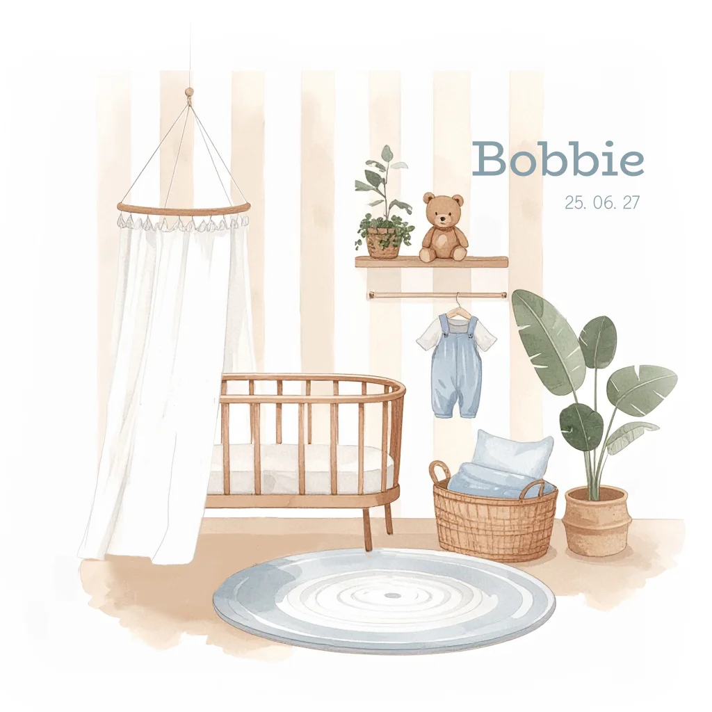 Een lief en klassiek geboortekaartje voor jouw kindje. Het kaartje heeft een vierkant formaat met daarop een prachtige illustratie van een kinderkamer. Pas het ontwerp naar wens zelf aan.