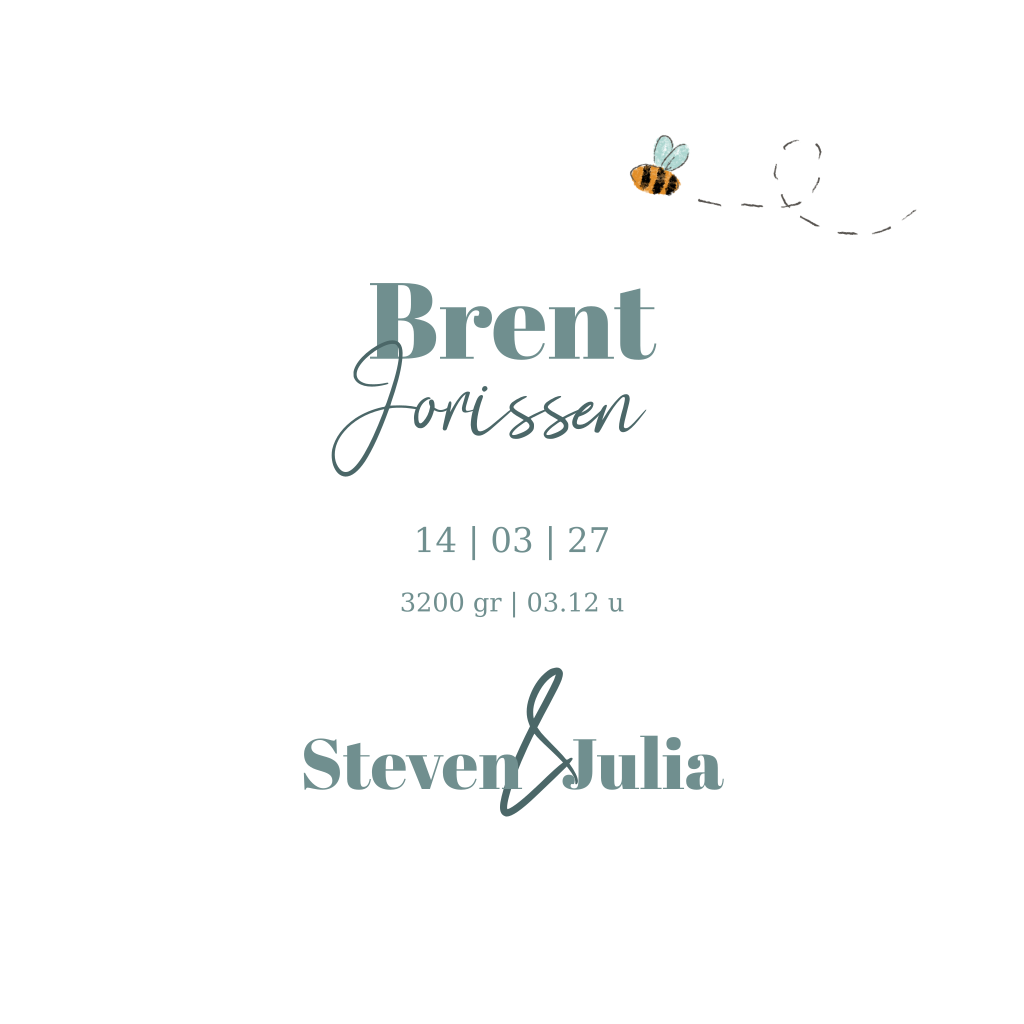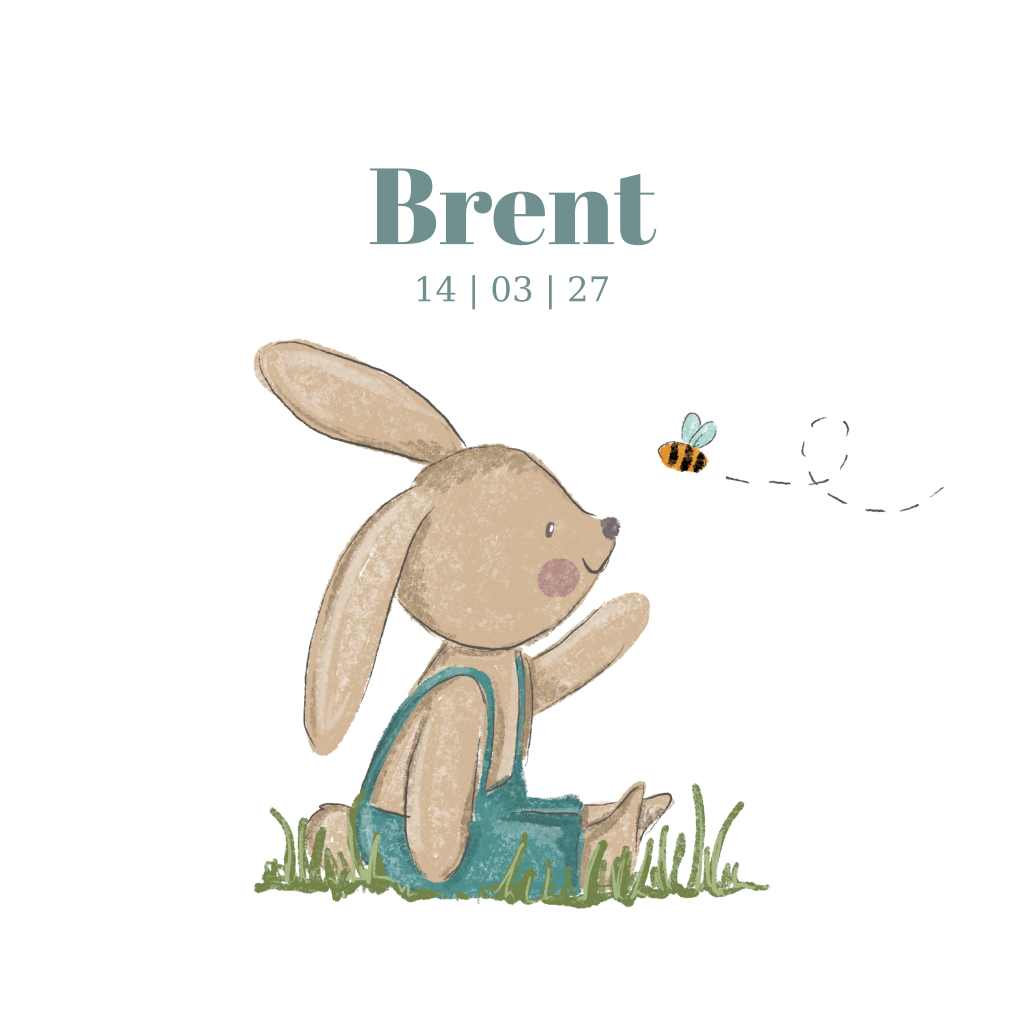Wat een schattig geboortekaartje voor een jongen. Dit vierkante kaartje heeft een witte achtergrond met daarop een lieve illustratie van een konijntje en bijtje. Boven het konijntje is er ruimte voor de naam van jullie kindje. Pas het kaartje naar wens aan in onze online editor.