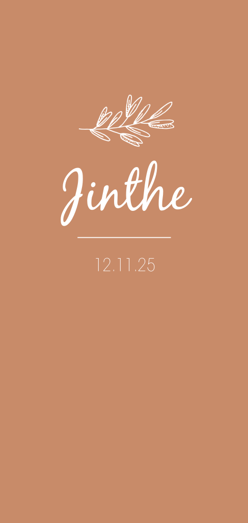 Hippe geboortekaart voor je dochtertje met minimalistisch ontwerp van een botanisch takje op een roest bruine aardetint kleur.