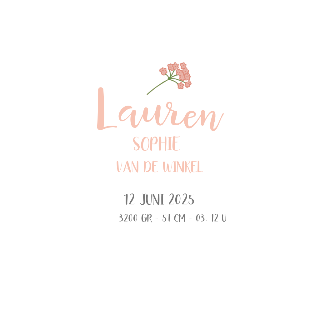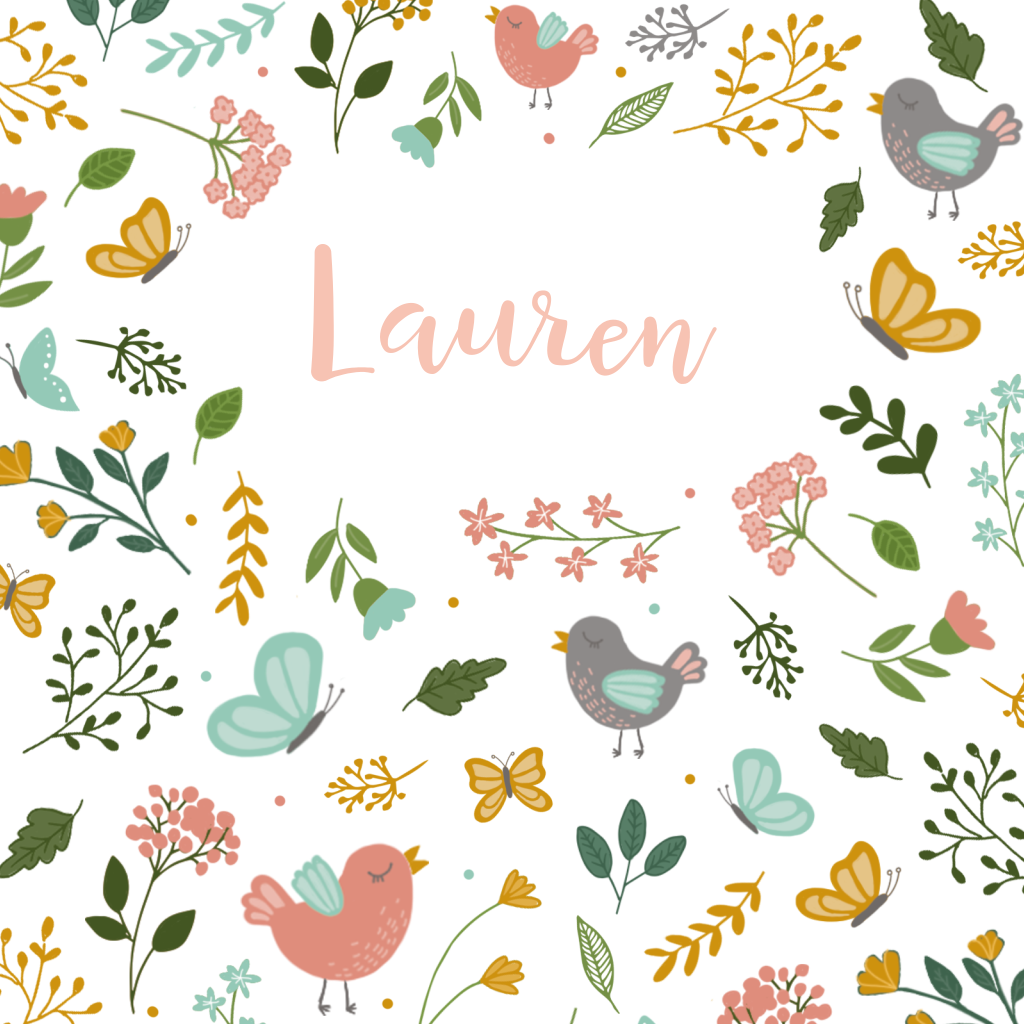 Lief kleurrijk geboortekaartje voor je dochtertje met vrolijke illustraties van vogeltjes, vlindertjes, bloemetjes en takjes. Pas de achtergrondkleur aan en maak dit schattige geboortekaartje af!