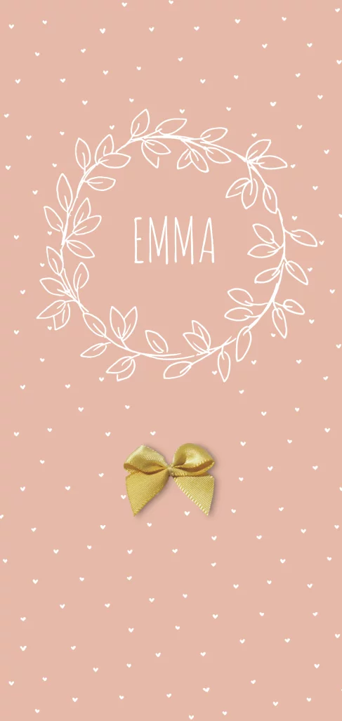 Schattig kaartje in perzik kleur met kleine hartjes en een botanische krans van bladeren. Het echte strikje maakt dit kaartje superlief!
