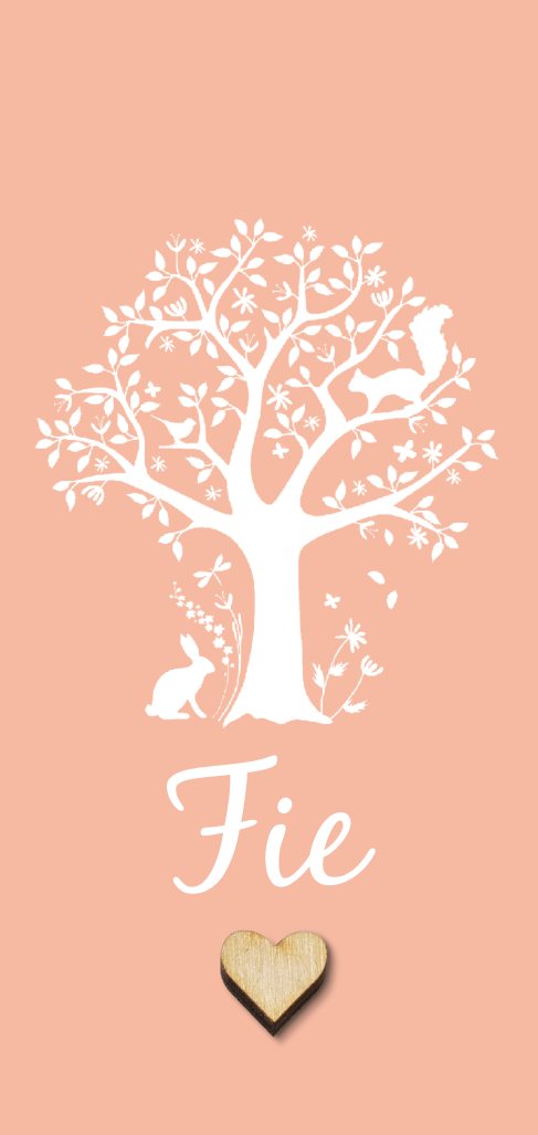 Lief geboortekaartje voor de je pasgeboren dochter met een silhouet van een boom met bloemen, konijn en eekhoorn op een perzik roze achtergrond. Plak op dit kaartje een echte houten hartje en bestel zo een uniek kaartje!