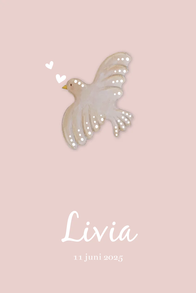 Een schattig roze geboortekaartje voor een meisje. Het kaartje heeft een roze achtergrond met daarop een illustratratie van een vogeltje. Op de vogel zitten verschillende goudfolie details. Ook de naam en geboortedatum is gedrukt in goudfolie.