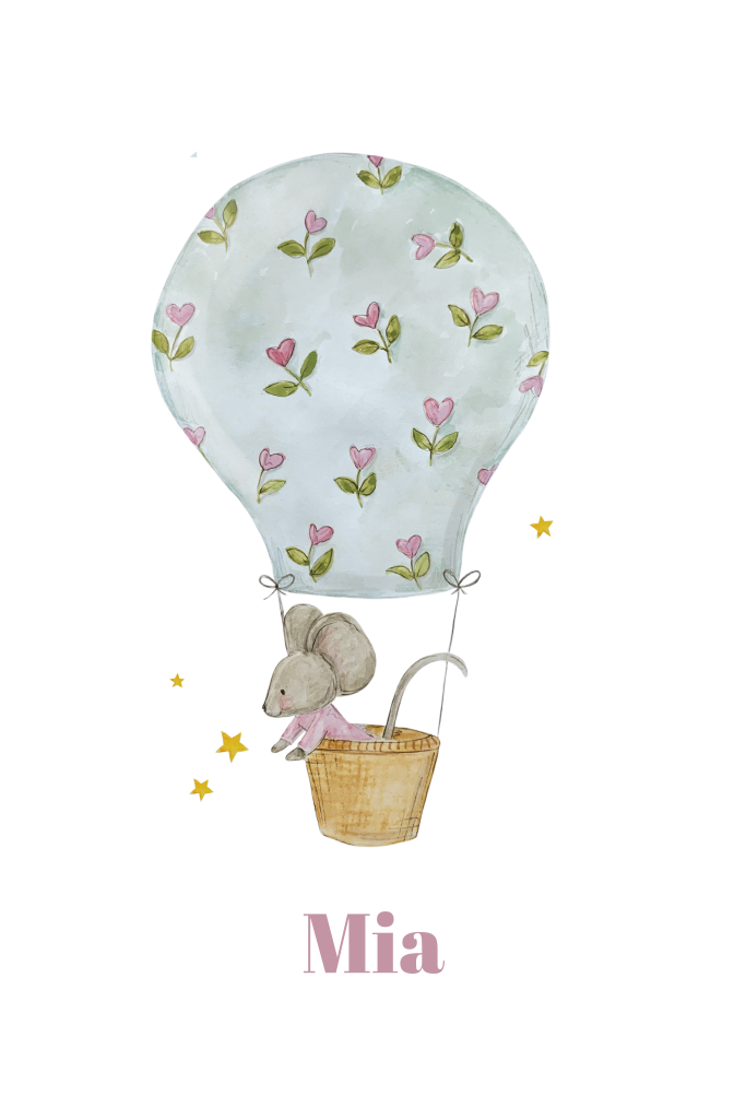 Schattig geboortekaartje meisje met muisje in luchtballon