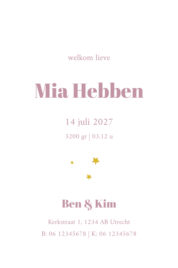 Een lief geboortekaartje voor een meisje. Het lieve geboortekaartje heeft een illustratie van een muisje in een luchtballon. Het muisje strooit met sterretjes om haar heen. Het kaartje heeft een staand formaat en is in onze online editor volledig te personaliseren.