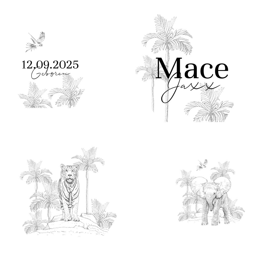 Maak de babykamer helemaal compleet met deze stoere muurdecoratie! De decoratie bestaat uit vier forex bordjes in hexagon vorm. De bordjes zijn zwartwit met jungle thema en hebben allemaal een ander design. De bordjes zijn helemaal naar wens aan te passen in onze online editor.