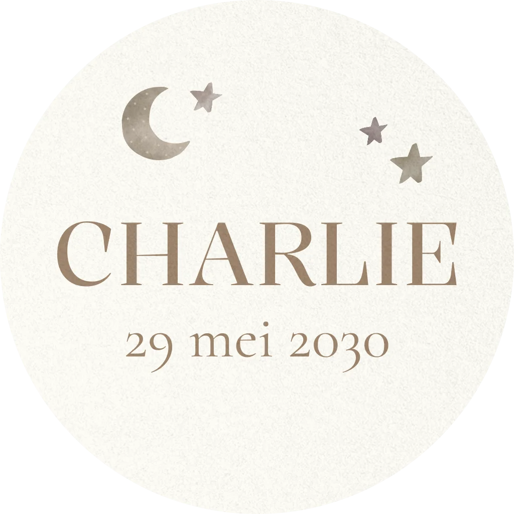 Vrolijke ronde naamsticker met maan en sterren. Super leuk voor doopsuiker en traktaties. De stickers hebben een diameter van 35 mm en worden geleverd op vellen van 25 stuks. Personaliseer eenvoudig in onze editor. Dit product maakt onderdeel uit van deze set.
