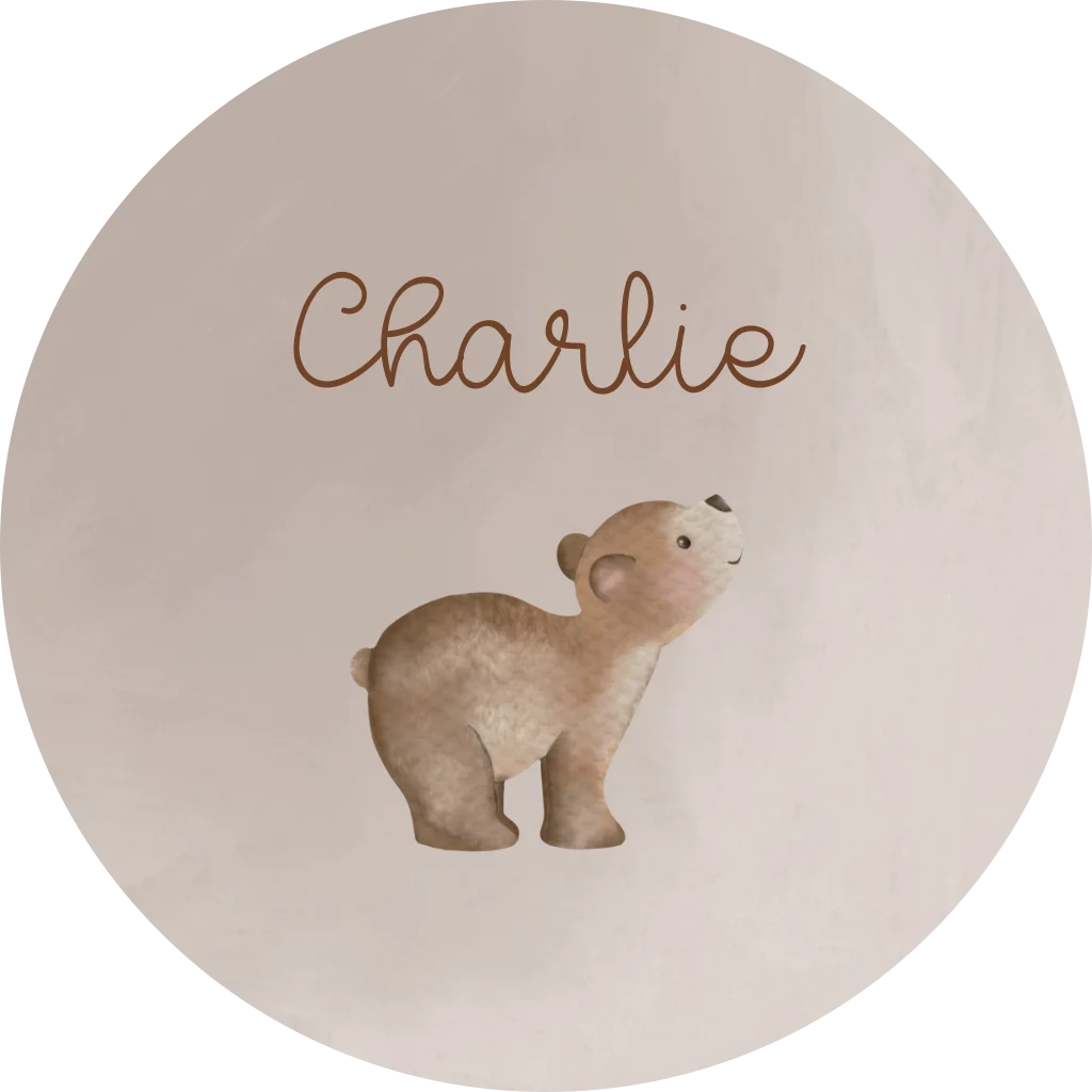 Wat een lieve naamsticker. De sticker heeft een bruine achtergrond met daarop een lief beertje. Pas het ontwerp naar wens zelf aan.