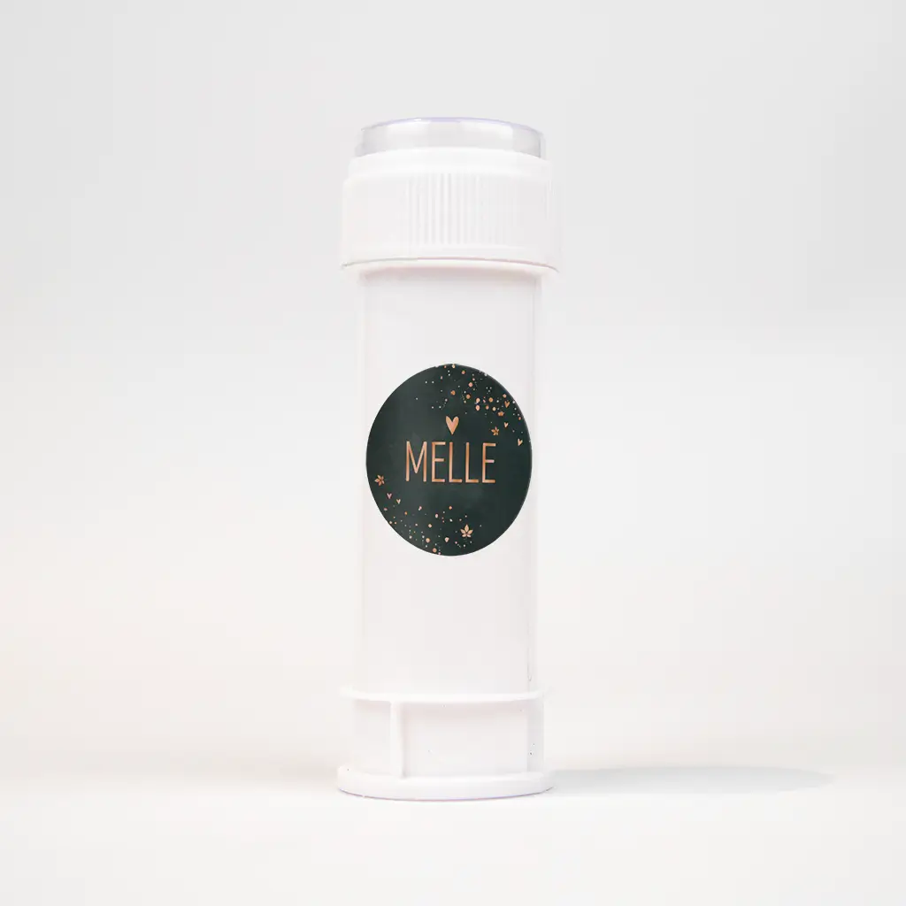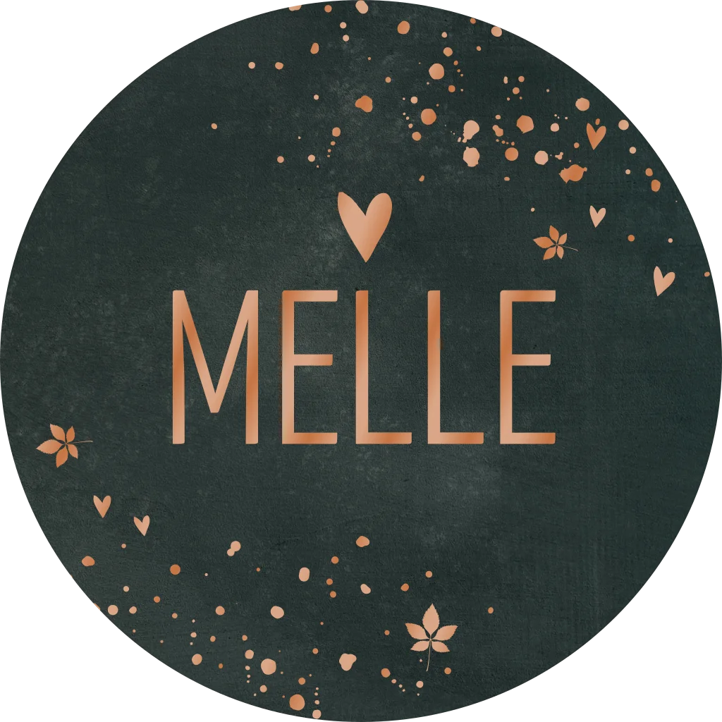 Supertof voor op de doopsuikers van jullie zoontje, deze donkergrijze naamsticker met hoogglans! Langs de rand een wolk van spetters, hartjes en bloemetjes in koperkleur. Pas het design geheel naar wens aan in onze editor.