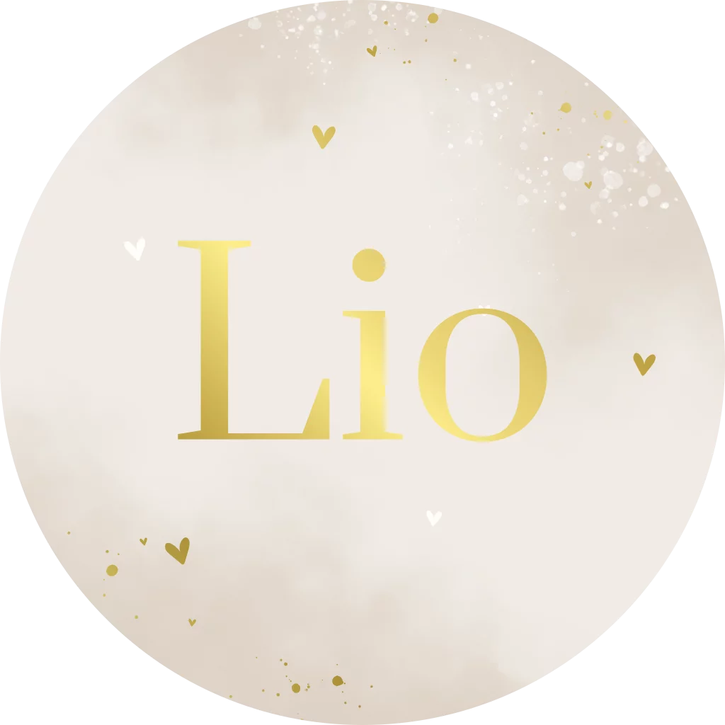 Geef de geboortebedankjes of doopsuikers een persoonlijk tintje met deze stijlvolle naamstickers. De naamstickers hebben een lichte watercolour achtergrond. De naam, geboortedatum en een aantal hartjes worden gedrukt in goudfolie. Pas het ontwerp gemakkelijk aan in onze online editor.