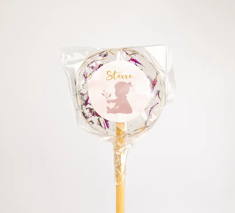 Schattige naamsticker in roze waterverf met het silhouet van een meisje met een klein bloemetje in de hand. Je kunt dit design nog helemaal naar wens aanpassen in onze online editor.