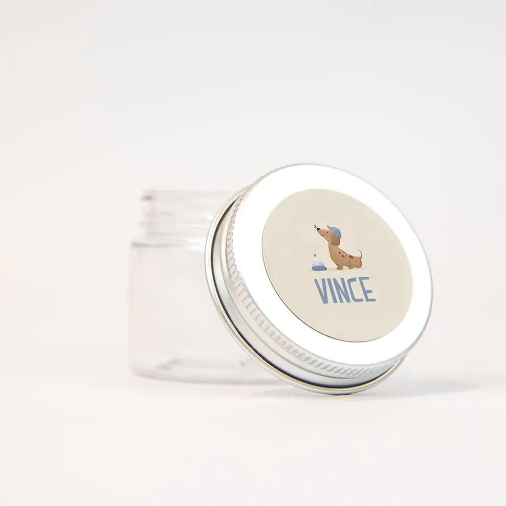 Geef de geboortebedankjes en doopsuikers een persoonlijk tintje met deze naamstickers. De stickers hebben een lichte achtergrond met de illustratie van een teckel.