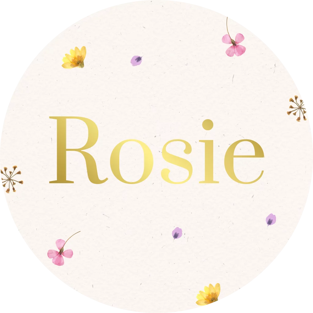 Dit zijn vrolijke naamstickers voor de geboortebedankjes en doopsuikers. De stickers hebben een lichte achtergrond met de kleurrijke illustraties van bloemen. De naam van jullie kleintje wordt gedrukt in goudfolie.