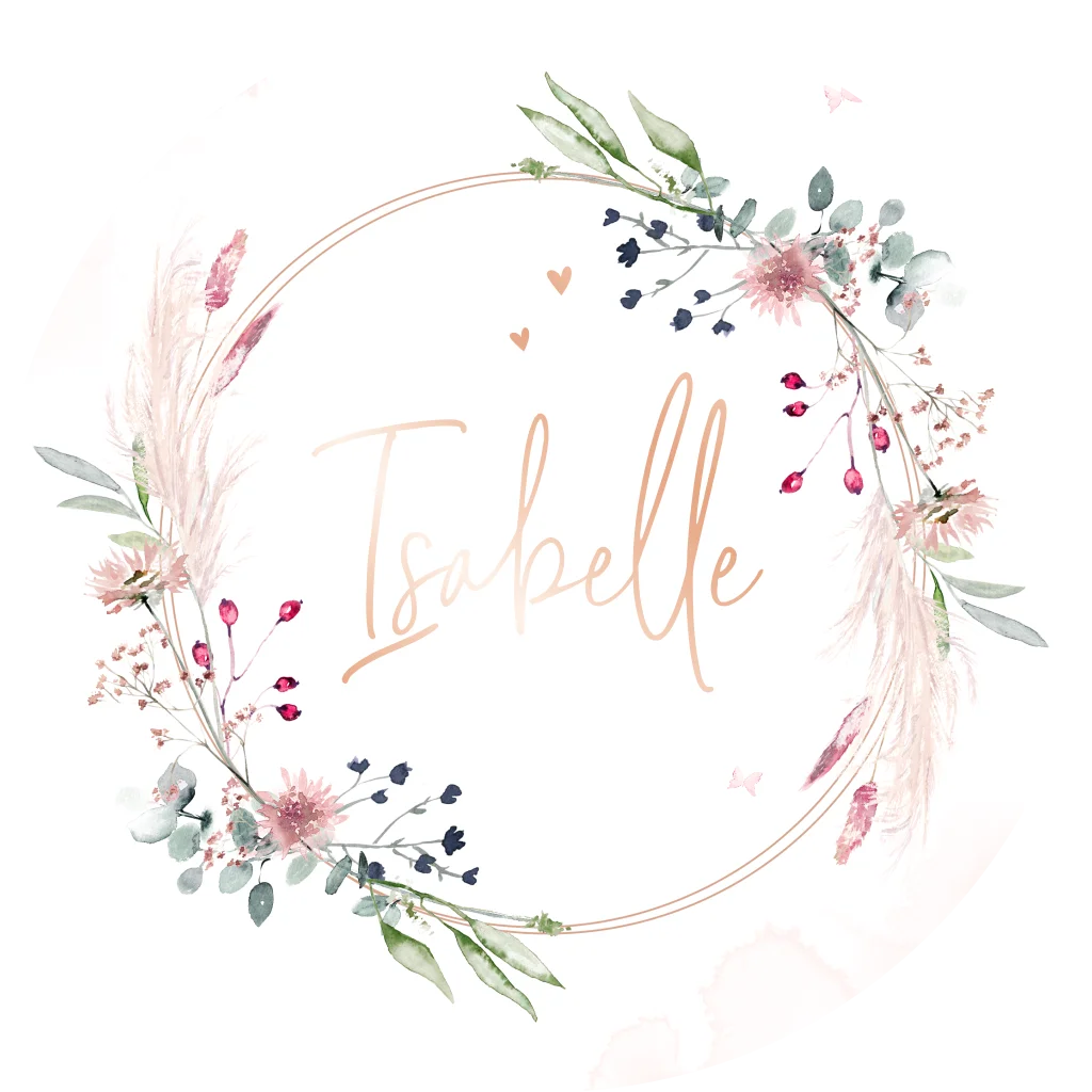 Watercolour naamsticker met roségoudfolie en bloemenkrans