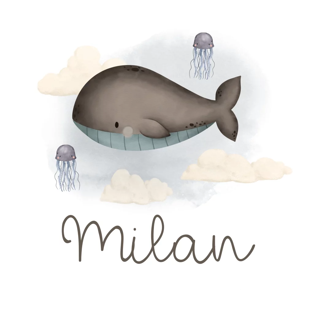 Avontuurlijke naamsticker met watercolour, walvis en kwallen