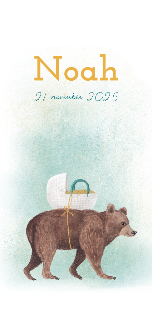 Kijk nou! De beer draagt het wiegje van de baby op zijn rug! Dit hippe, langwerpige geboortekaartje met tekening heeft een groene watercolourachtergrond die supermooi combineert met de okergele naam. Leuk voor een jongen!