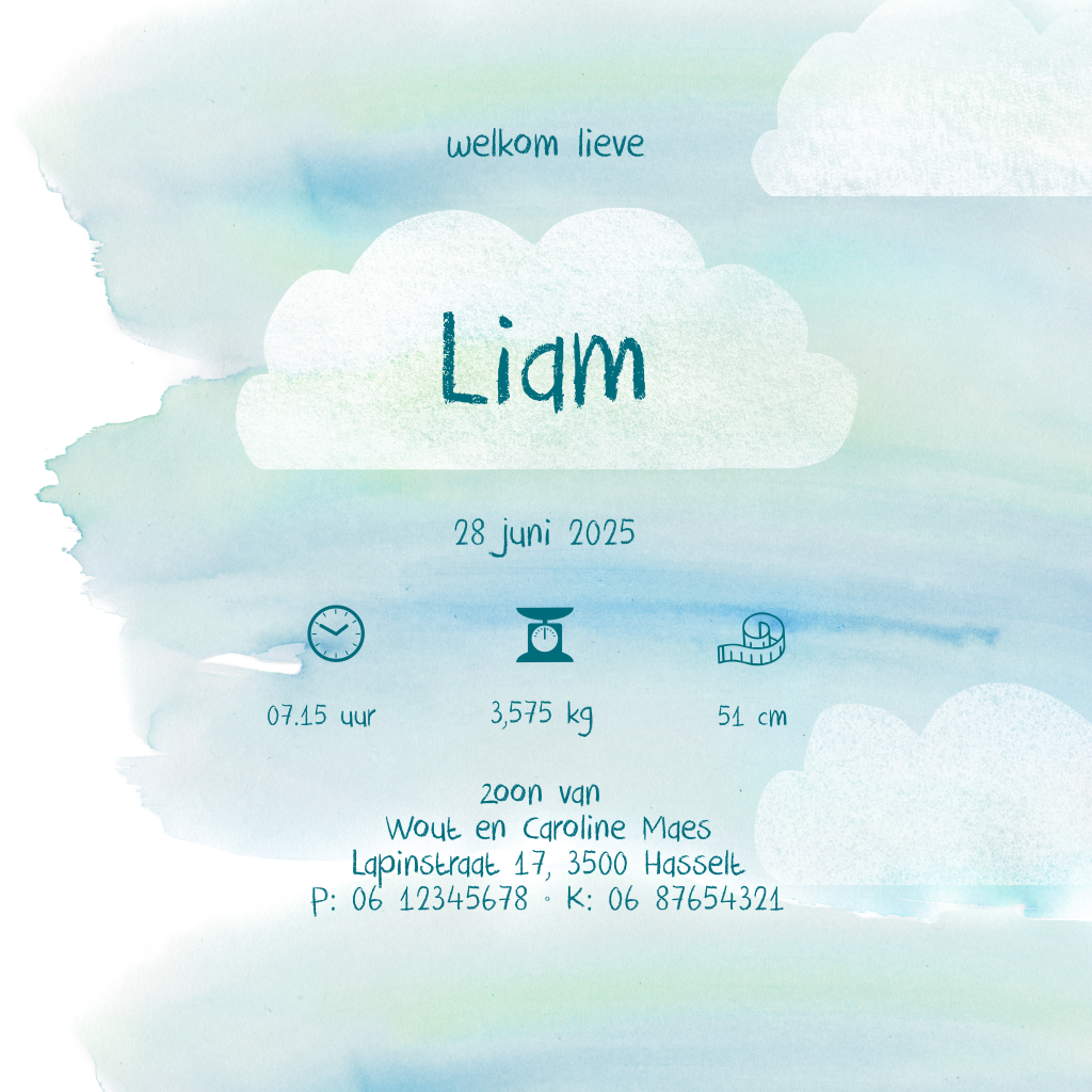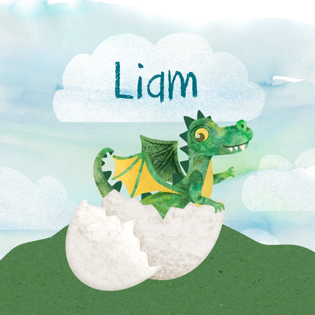 Illustratief, sprookjesachtig geboortekaartje met een draakje dat net uit het ei komt. Leuk voor een zoontje! De lucht is gemaakt van watercolourverf in prachtige tinten blauw en groen. Schrijf je eigen teksten aan de binnenkant van deze kaart en maak hem zelf af!