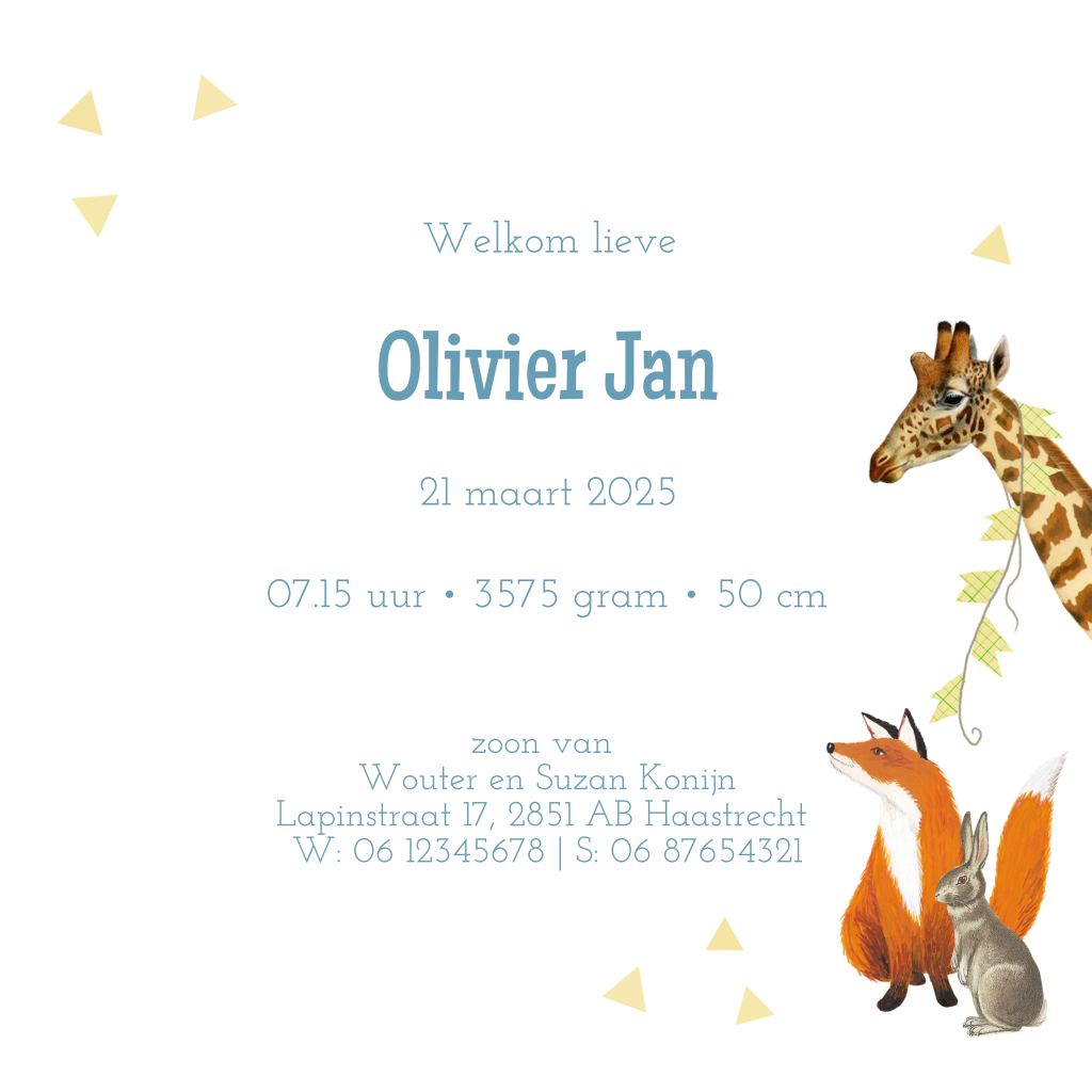 Origineel geboortekaartje zoon met een auto met daarin allerlei vrolijke dieren en op het dak van de auto een wiegje. Pas zelf de kleur van de achtergrond en het driehoekjes patroon naar wens aan in de editor.