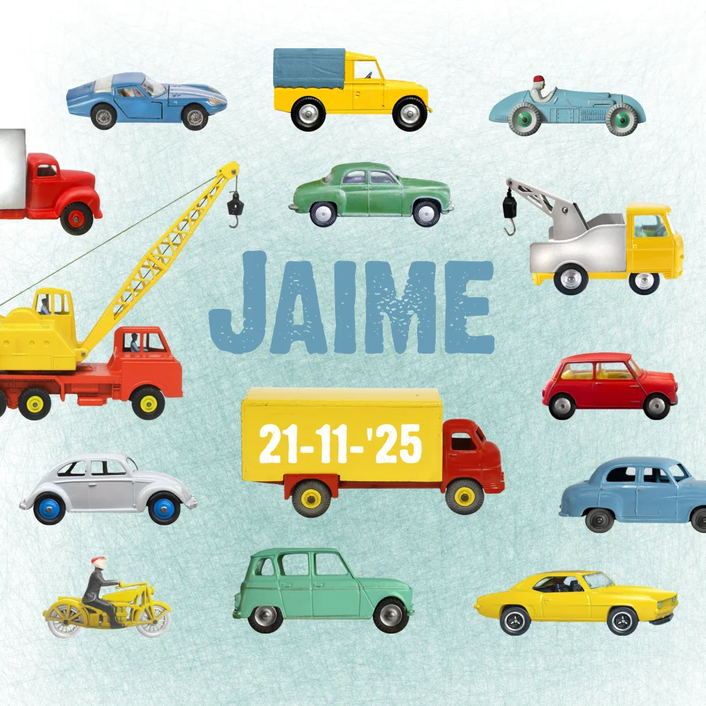 Een vrolijk geboortekaartje met verschillende coole speelgoedauto's! Aan de binnenkant van de kaart komen de auto's weer terug. Uniek is ook de achtergrond met groene watercolourverf. Dit ontwerp van Petit Konijn is echt wat voor een zoontje!