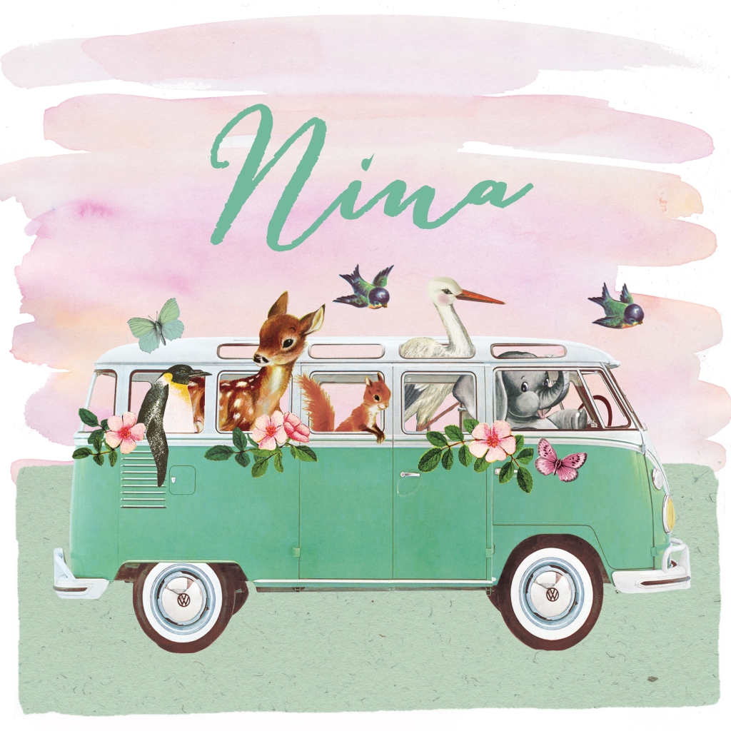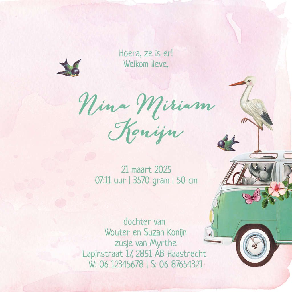 Origineel, lief geboortekaartje met volkswagenbusje met dieren op een watercolour achtergrond. Het kaartje heeft verschillende vintage illustraties.
