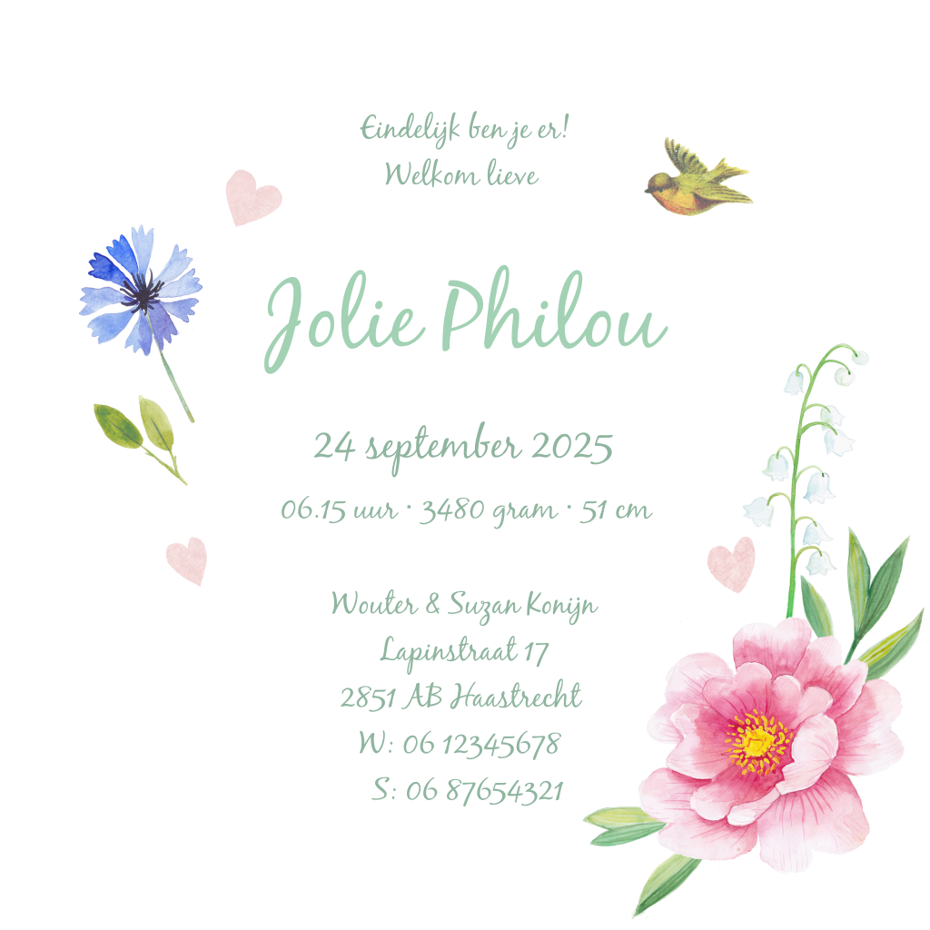 Romantisch geboortekaartje met hart, vogeltjes en bloemen