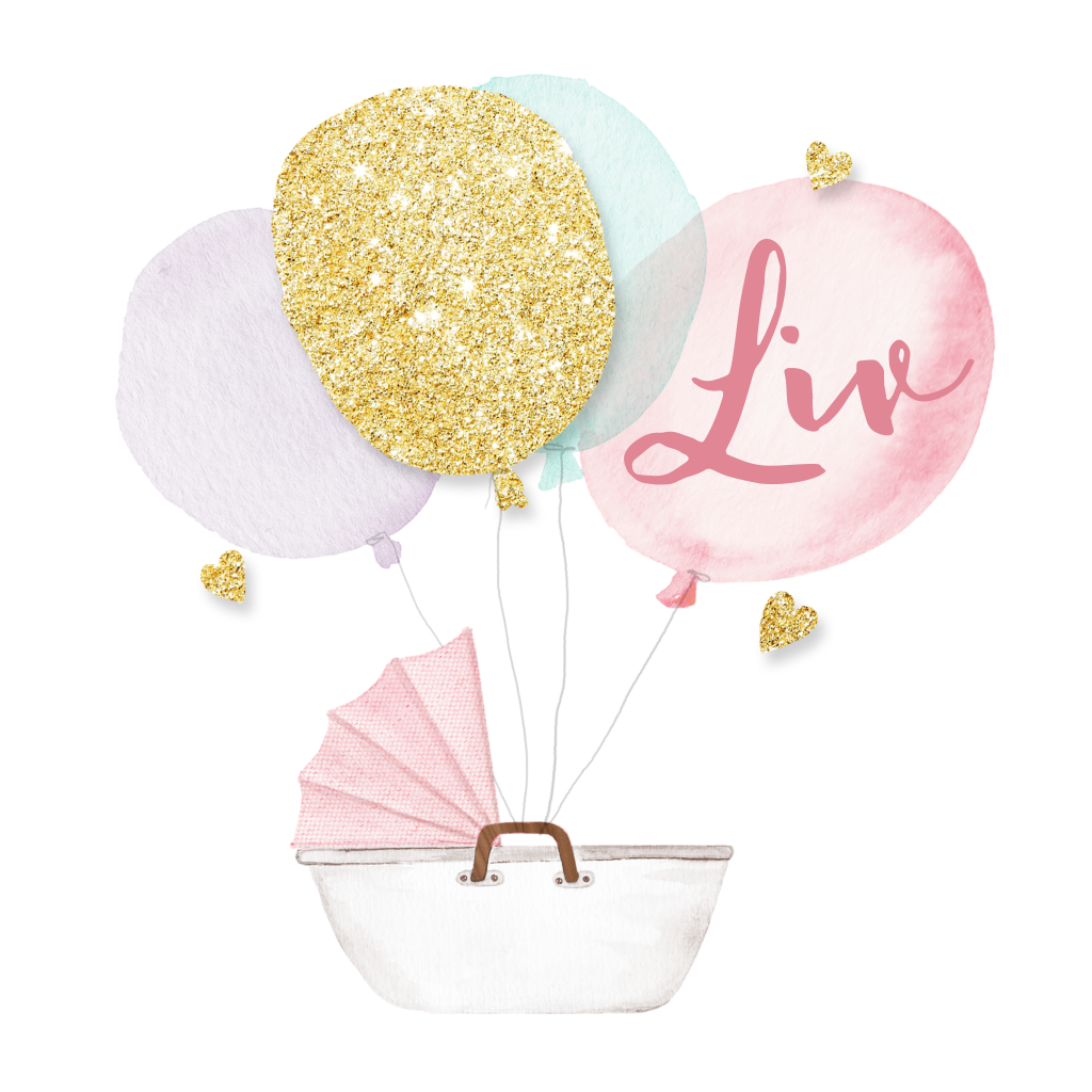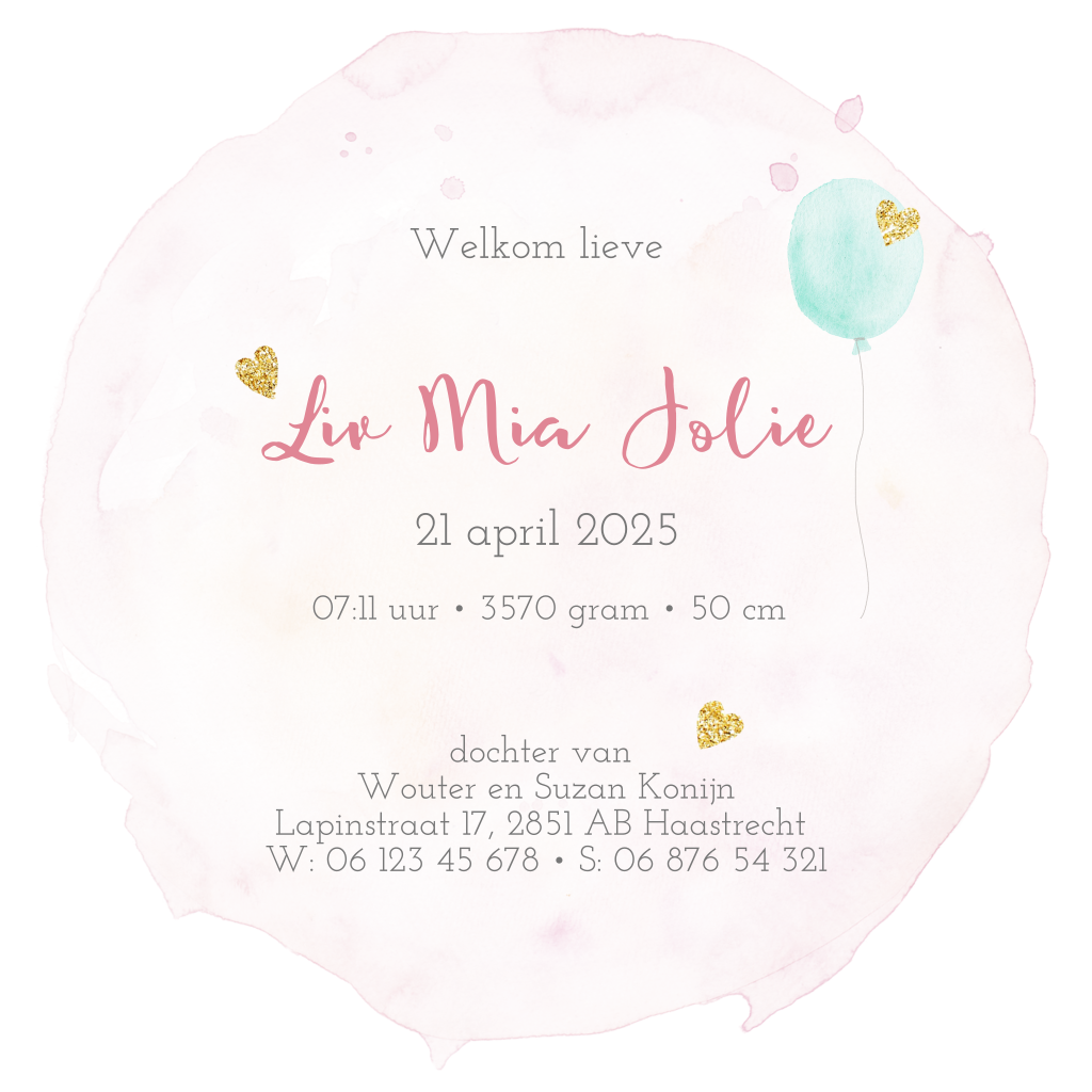 Schattig kaartje voor de geboorte van je dochter met een wiegje gedragen door ballonnen. Mooi met zacht roze, mint en lila waterverf en glitterdetails in goudlook. Aan de binnenkant zit mooie roze watercolor verf.