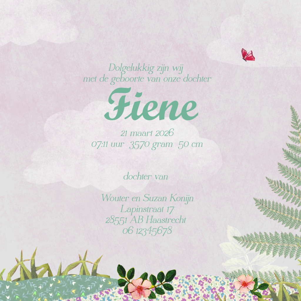 Wat een mooi romantisch en nostalgisch geboortekaartje met deze ooievaar met een kindje op zijn rug. Omringd door planten en bloemen in een roze landschap.