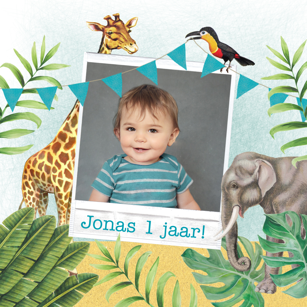 Wordt jouw zoontje alweer 1 jaar? Tijd voor zijn eerste feestje! Stuur een uitnodigingskaartje in junglethema met een giraffe, olifant en toekan en vrolijke slingers. In het middelpunt staat een polaroidkader waarin je een eigen foto toe kunt voegen: superleuk!