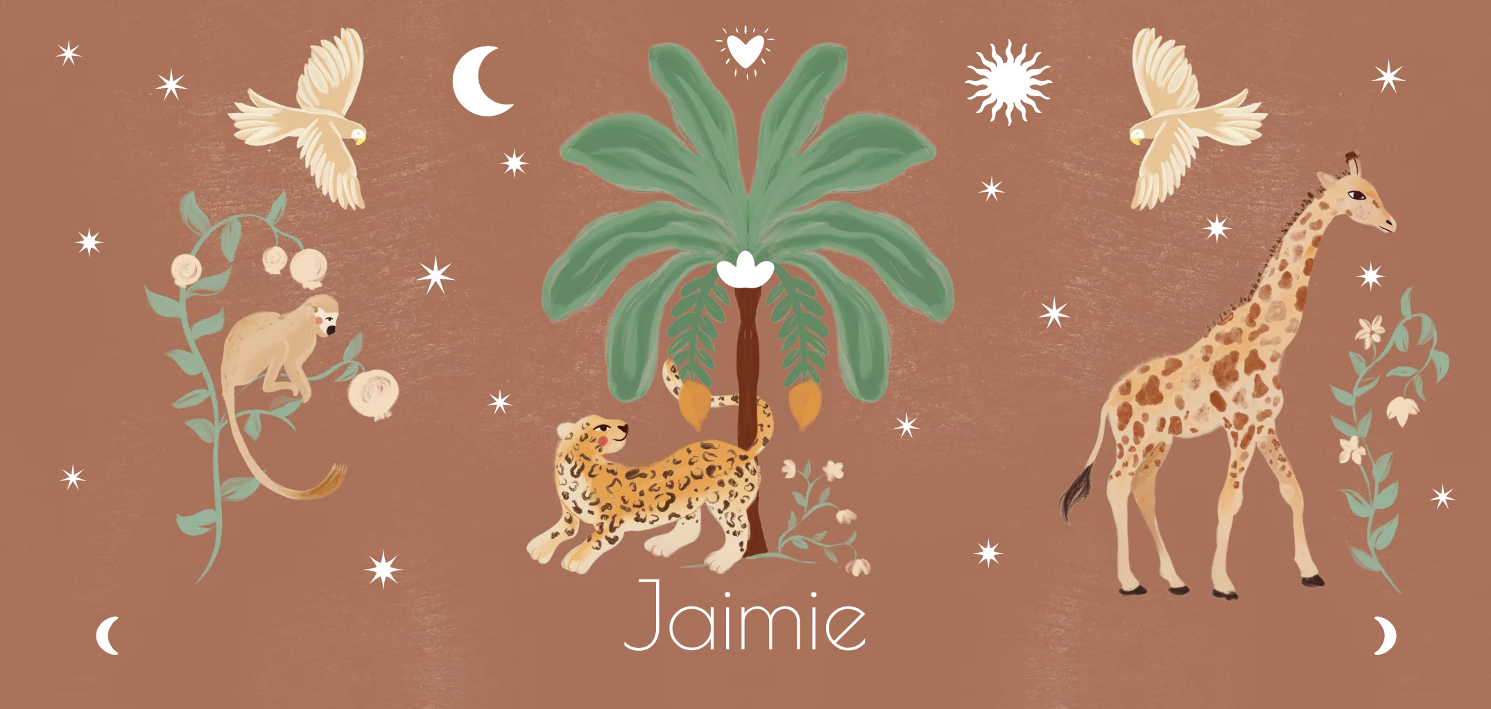 Dit bijzondere geboortekaartje heeft een prachtige roestbruine kleur en trendy illustraties van jungledieren. Pas het kaartje naar wens aan en bestel een proefdruk om de kaart in het echt te bewonderen.