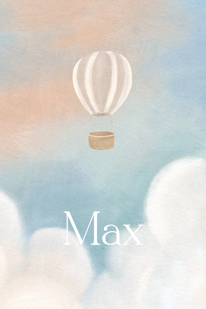 Een stijlvol geboortekaartje voor jouw zoon. Het kaartje heeft een dromerige blauwe achtergrond met daarop een luchtballon en wolkjes. De naam wordt gedrukt in goudfolie. Pas het ontwerp naar wens aan in onze online editor.