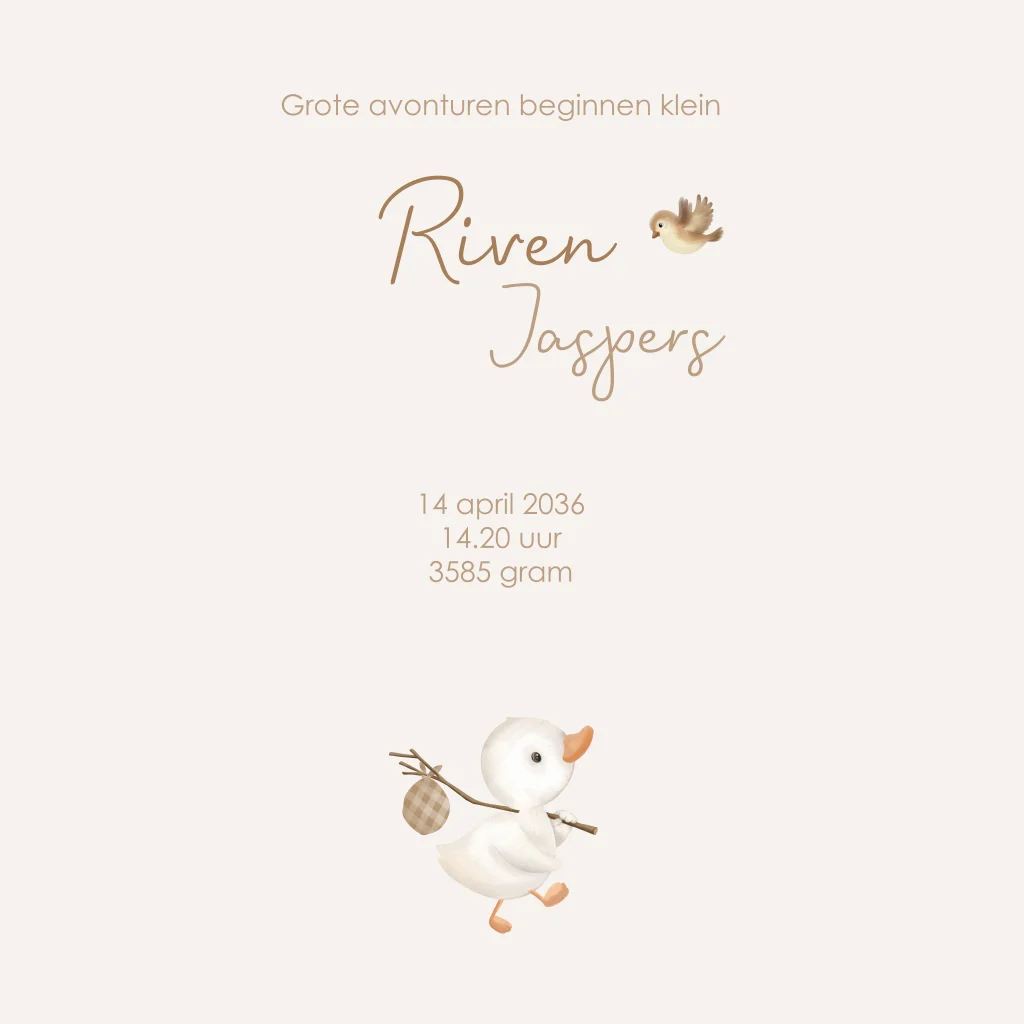 Geboortekaartje voor een jongen met een lief eendje en vrolijke vogeltjes op een beige gestreepte achtergrond. Een schattig en vrolijk ontwerp om de komst van jullie zoon op een bijzondere manier aan te kondigen.