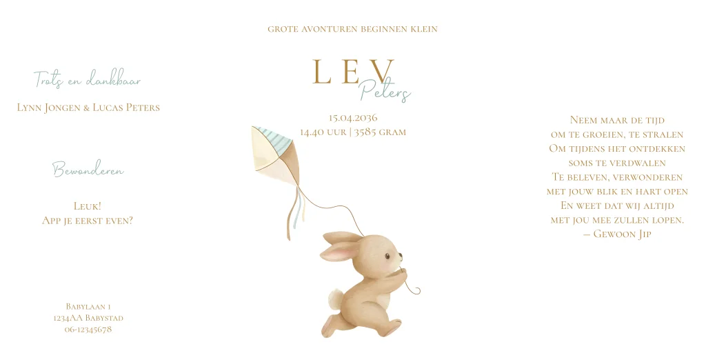 Geboortekaartje voor een jongen in theater‑vorm, met een lief konijntje en een vlieger. Een speels en charmant ontwerp om de geboorte van jullie zoon op een bijzondere manier aan te kondigen.