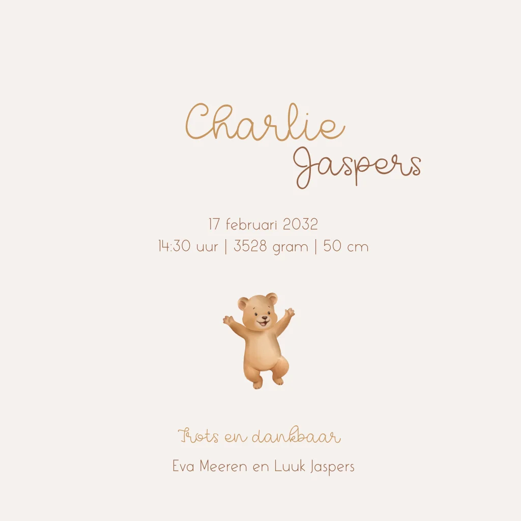 Een lief geboortekaartje voor een eerste kindje. Op het kaartje zie je een familie van beren met springtouw. Het vrolijke geboortekaartje heeft een vierkant formaat. Pas het ontwerp naar wens aan in de online editor.