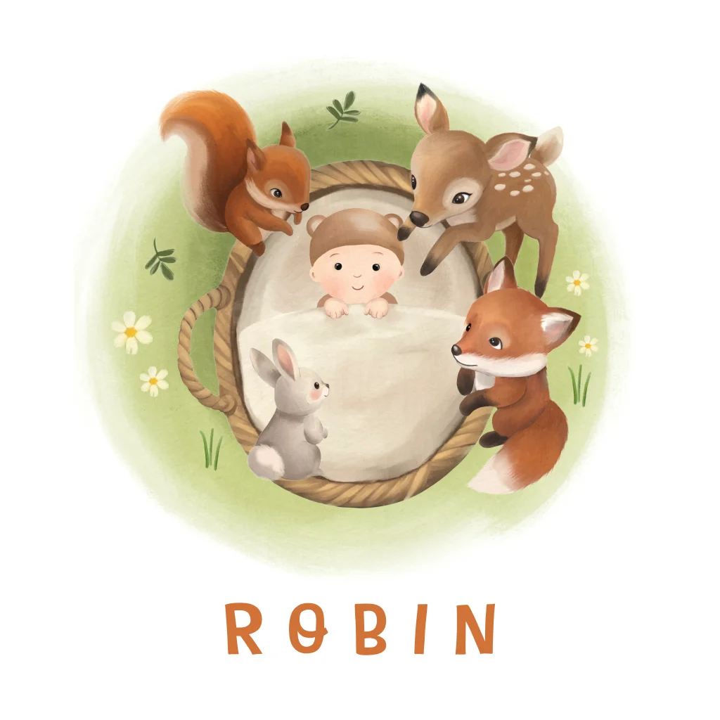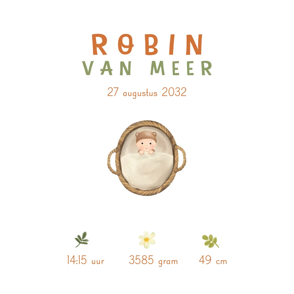 Een lief geboortekaartje voor jouw kindje. Op het kaartje zie je een illustratie van een baby in een mandje omringd door lieve bosdieren in het gras. Het geboortekaartje heeft een vierkant formaat. Pas het ontwerp naar wens aan in de online editor.