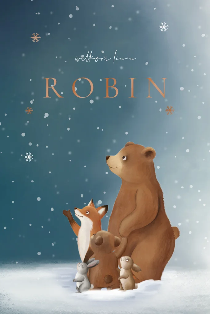 Een lief geboortekaartje voor jouw kindje. Op het kaartje zie je lieve winterdieren in de nacht. De letters in hoogglans geven dit kaartje een luxe finish. Pas het ontwerp naar wens aan in de online editor.