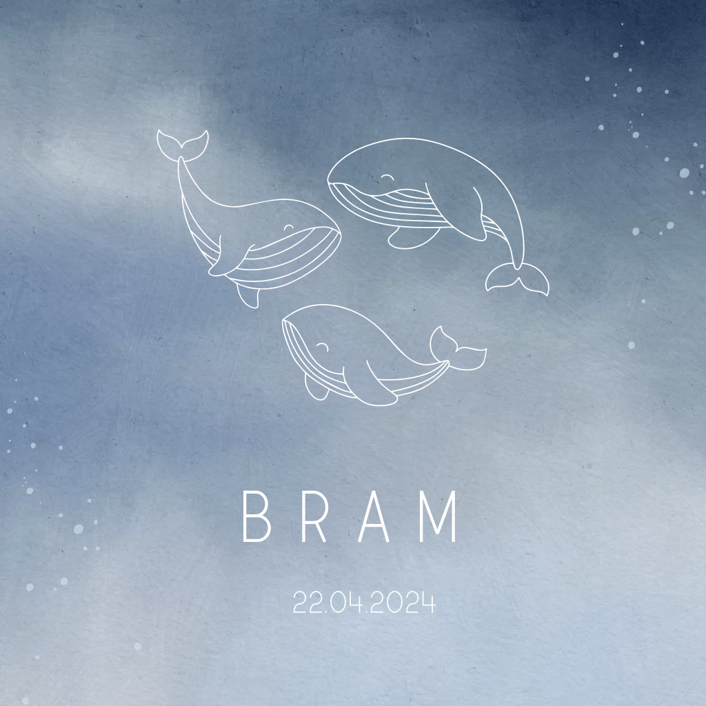 Blauw geboortekaartje met goudfolie lijntekeningen van walvissen