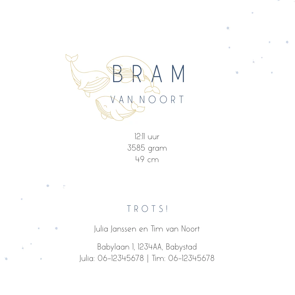 Dit is een prachtig kaartje voor je pasgeboren zoon. Het kaartje heeft een blauwe achtergrond met de goudfolie lijntekeningen van walvissen. De spetters geven dit kaartje een luxe uitstraling. Het kaartje is helemaal naar wens aan te passen in onze online editor.