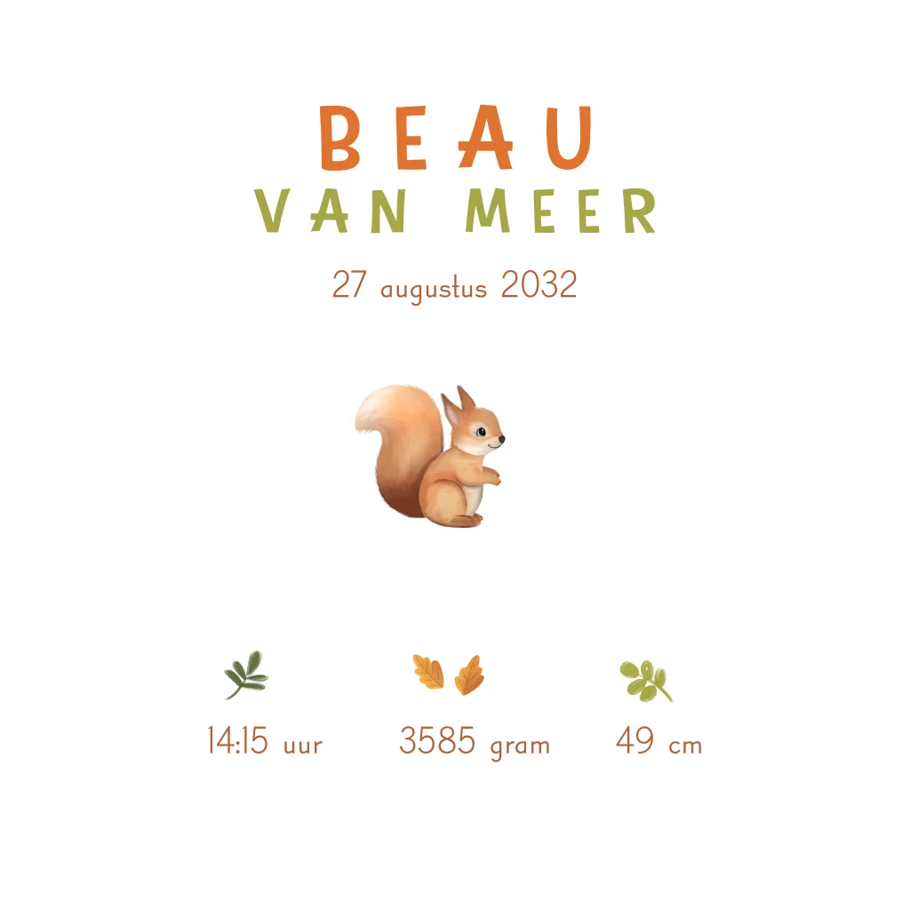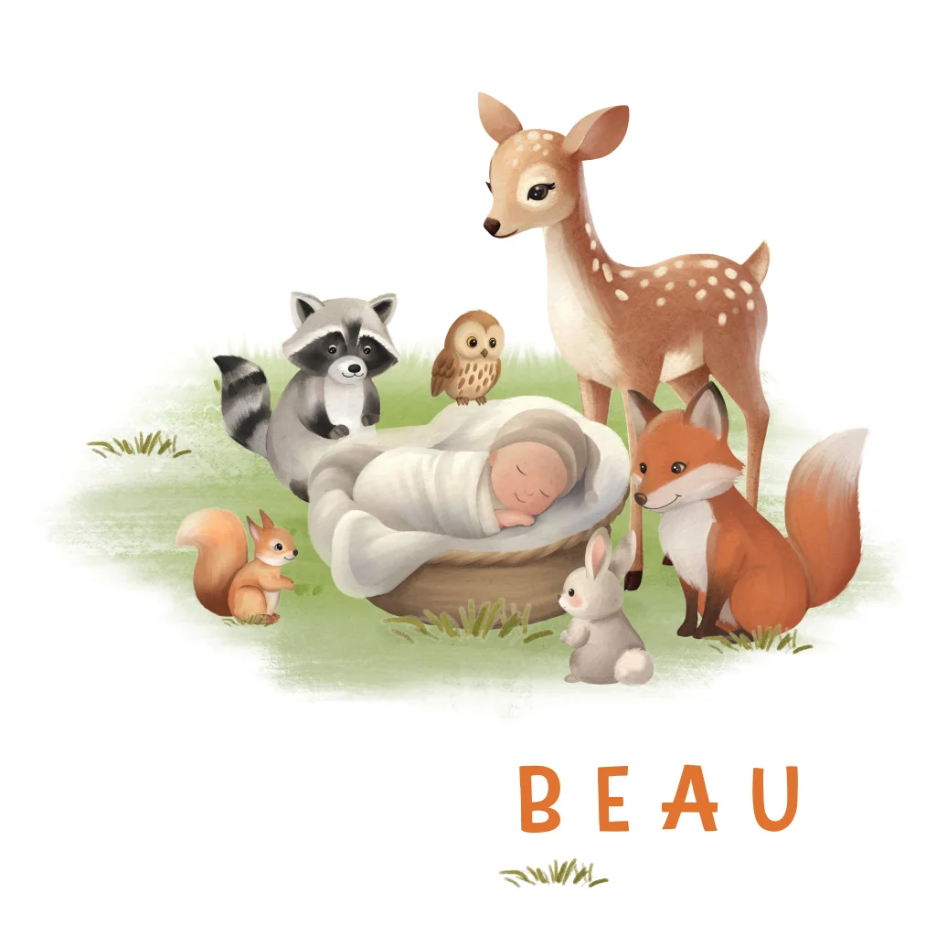 Een lief geboortekaartje voor jouw kindje. Op het kaartje zie je een illustratie van een baby in een mandje omringd door lieve bosdieren. Het geboortekaartje heeft een vierkant formaat. Pas het ontwerp naar wens aan in de online editor.