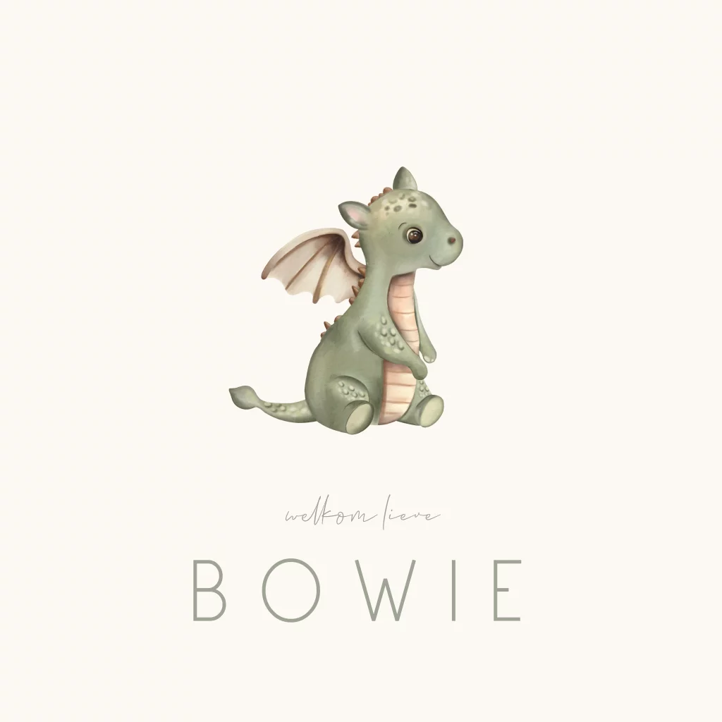 Een lief geboortekaartje met een illustratie van een schattige baby draakje. Het kaartje is volledig te personaliseren in onze online editor.