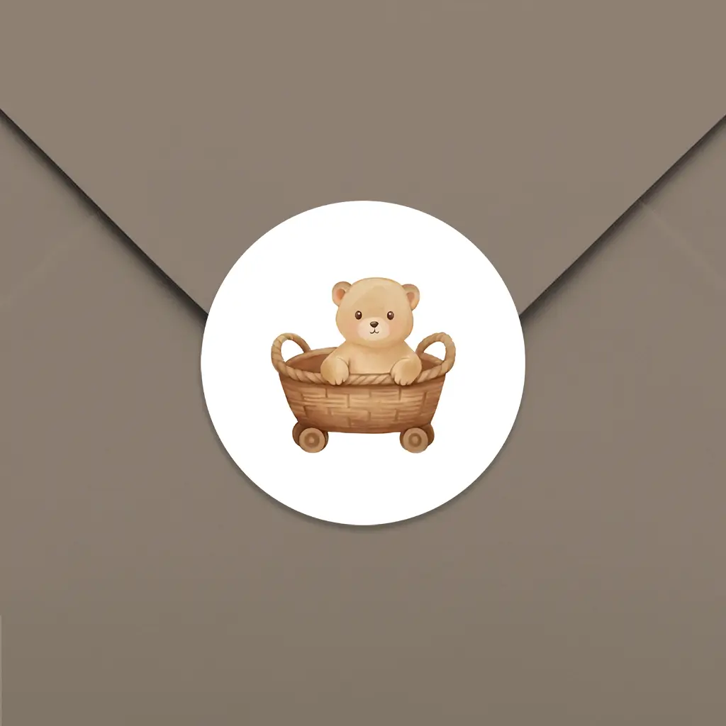 Lieve sluitsticker met de illustratie van een beertje in een mandje. Pas de sticker eenvoudig aan in onze online editor. Bekijk hier het bijpassende geboortekaartje.