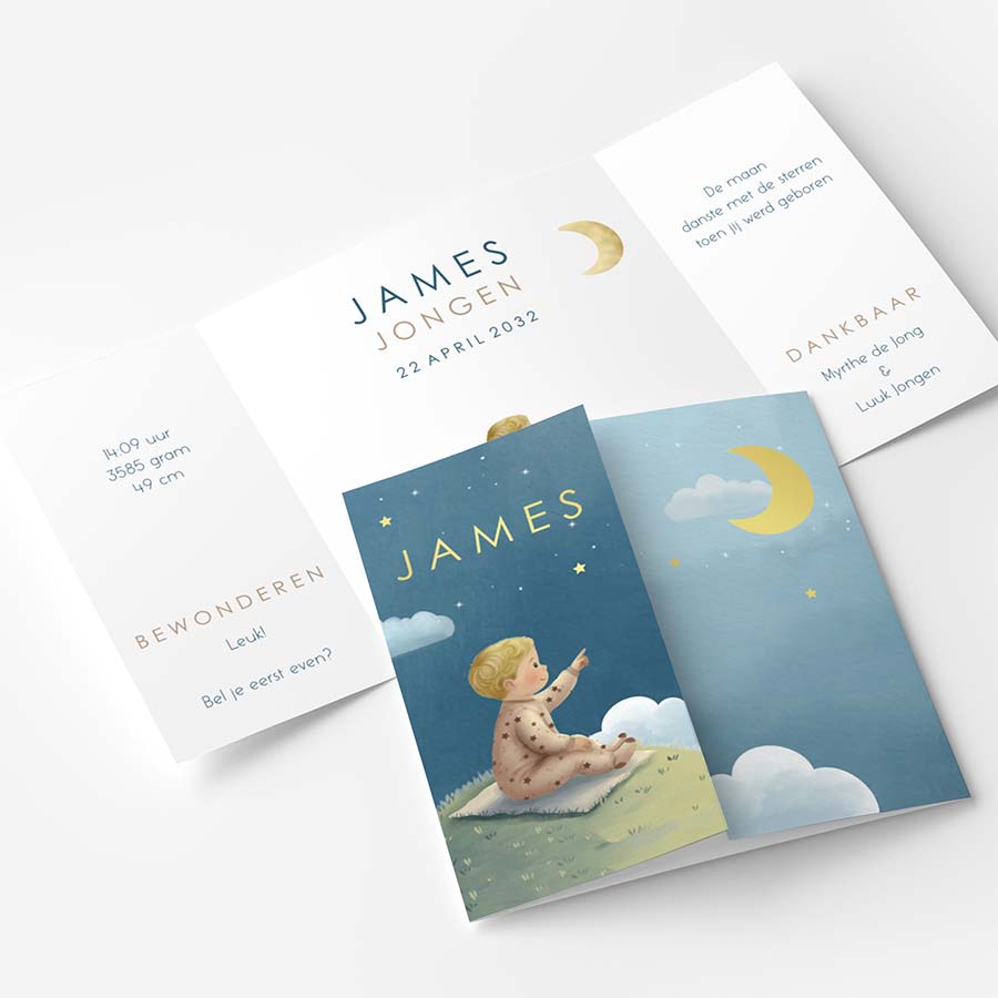 Een lief en dromerig geboortekaartje om de komst van jullie zoon aan te kondigen! Op de kaart kijkt een jongetje naar de maan. De theatervorm maakt dit kaartje extra bijzonder. Personaliseer het ontwerp en bestel een proefdruk om het in het echt te bewonderen.